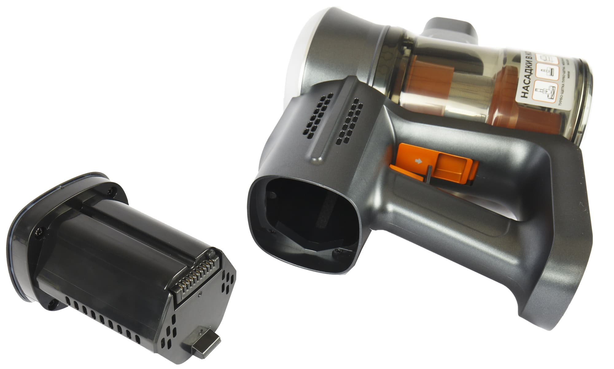 Кнопка управления мощностью располагается прямо на съемном аккумуляторе. Такое решение обосновано с точки зрения эргономики, но не слишком популярно среди производителей пылесосов. Мы встречали его только один раз — у Polaris PVCS 7000. Расположенный под кнопкой разъем предназначен для подключения зарядного устройства.
