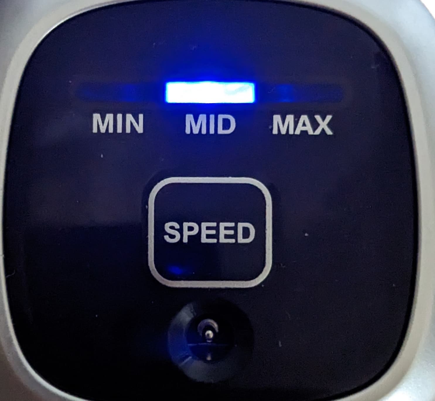 Синие светодиодные индикаторы на верхней стороне моторного блока показывают текущий уровень заряда (на прямоугольном трехсегментном экране) и выбранную скорость (на квадратной панели).