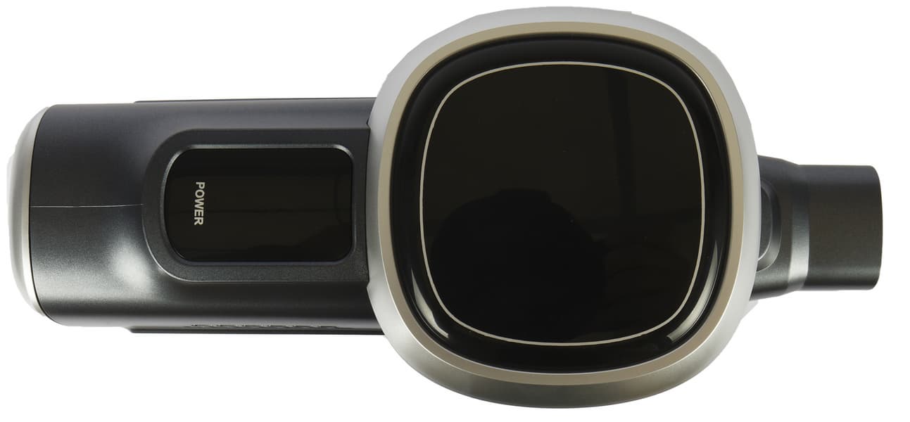Сверху — два дисплея из гладкого темного пластика. При выключенном пылесосе индикаторы малозаметны (мы рассмотрим их повнимательнее, когда включим прибор).