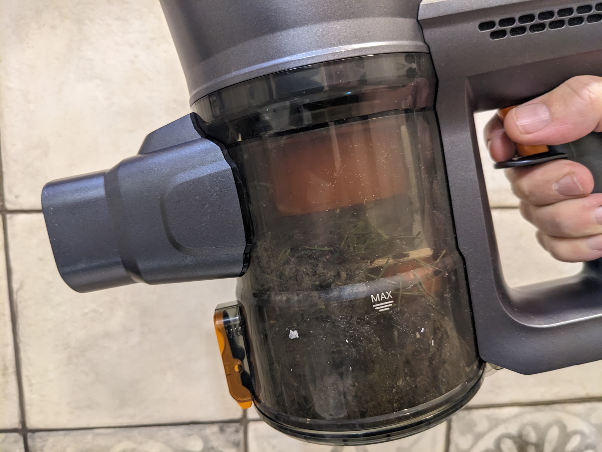 Для опорожнения пылесборника служит откидывающаяся крышка, удерживаемая оранжевой клавишей. Вытряхивать мусор можно одной рукой без риска запачкаться или просыпать содержимое.