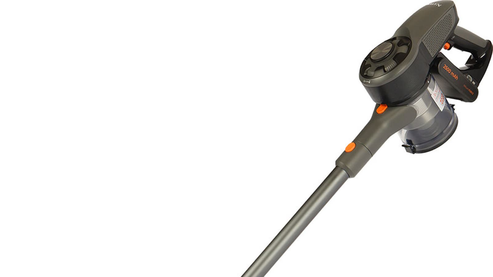 Компоновка традиционна для аккумуляторных пылесосов с поперечным расположением циклонного фильтра: над контейнером для мусора находится выпускной фильтр, за ним — электродвигатель, под которым — рукоятка пистолетного типа со «спусковым крючком», включающим и выключающим устройство.