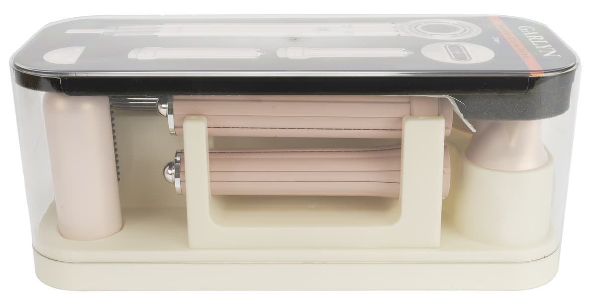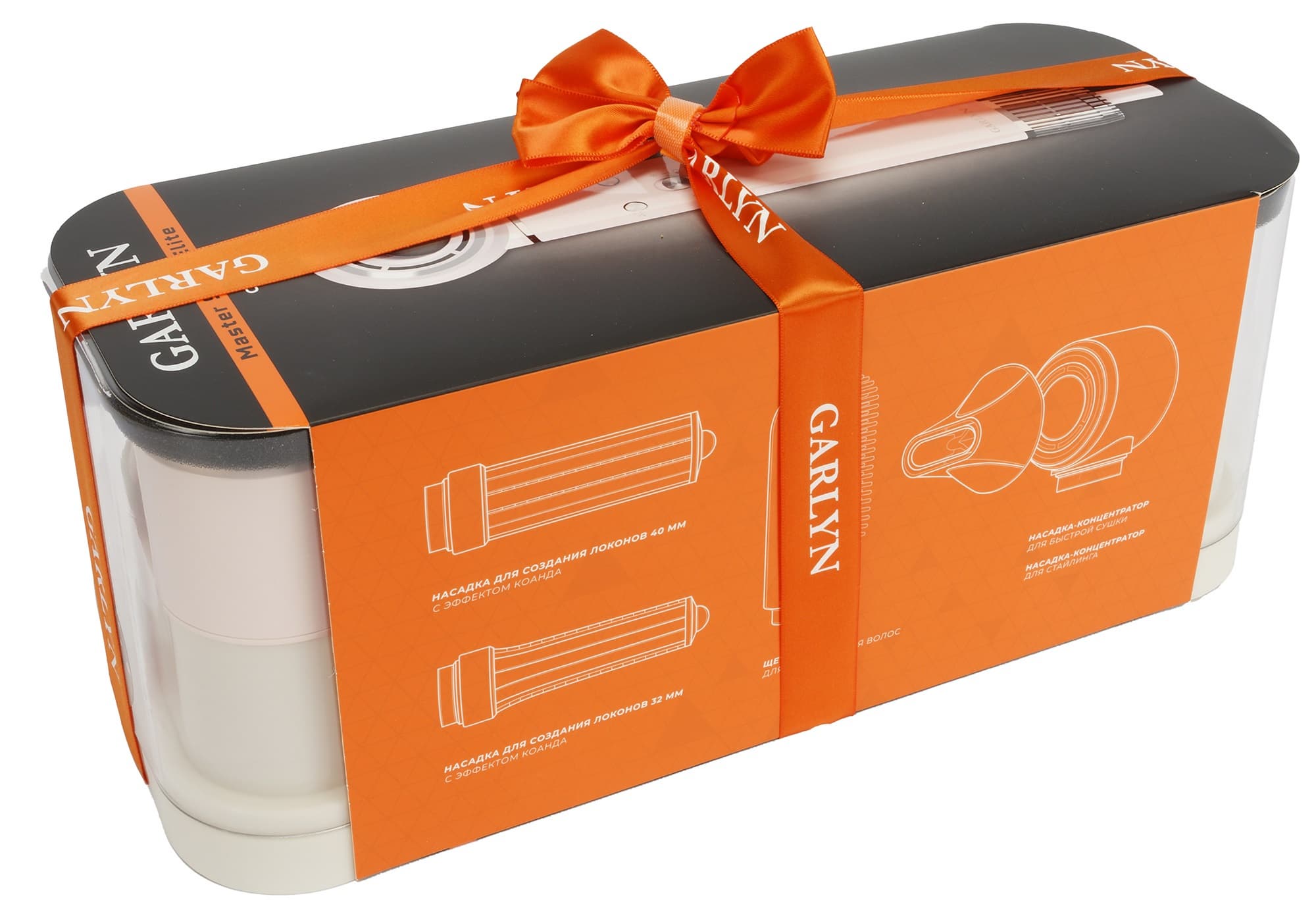 Фен-стайлер Garlyn попал к нам в простой минималистичной картонной коробке с нанесенным на нее лого производителя, названием модели, графическим рисунком фена и насадок на боковых стенках коробки.