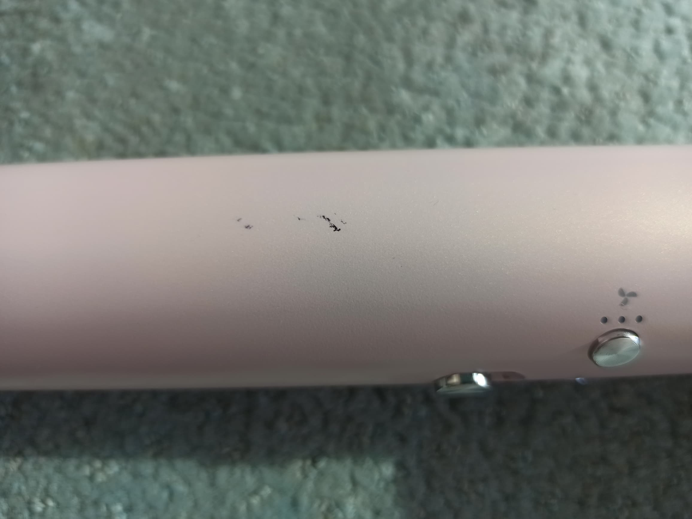 Однако были также обнаружены минусы покрытия. Наше первое впечатление о том, что серебристое покрытие пластиковых частей корпуса является слабым местом, подтвердилось. Несмотря на бережное обращение с феном, довольно быстро мы обнаружили несколько царапин как на корпусе, так и на серебристых деталях. Краска, покрывающая детали фена, оказалась не самой устойчивой.