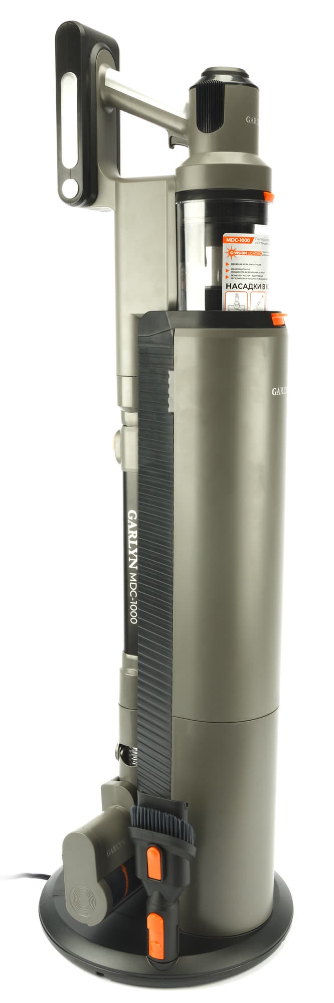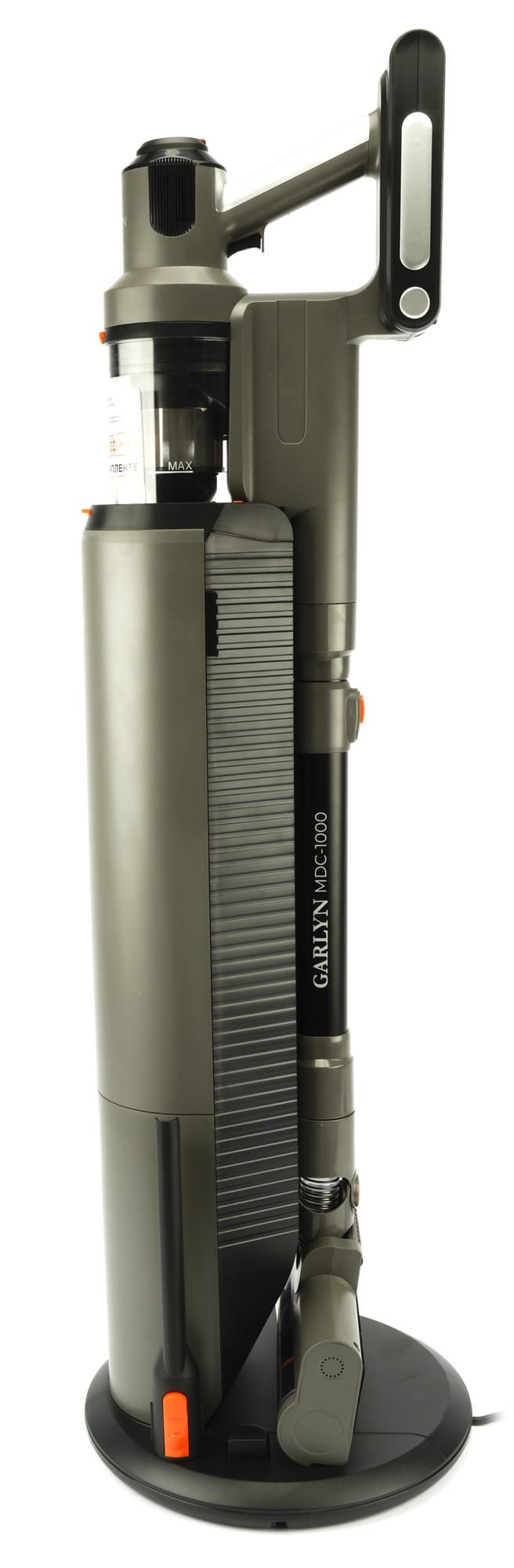 Вертикальный аккумуляторный пылесос со станцией самоочистки Garlyn MDC-1000 позволяет своему хозяину не пачкать рук не только во время, но и после уборки. Всего-то и надо, что поставить его на базу: если включен автоматический режим, то даже кнопку нажимать не придется.