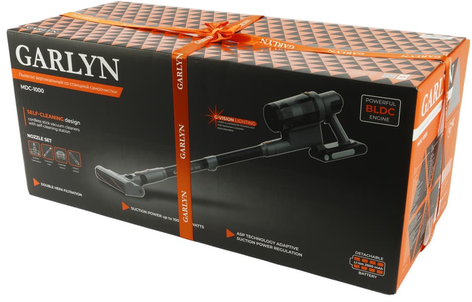 Пылесос приехал к нам в коробке из картона с полноцветной печатью и контрастным узором из черно-оранжевых треугольников на верхней и нижней крышках. Как обычно, умиляет шелковая ленточка с накладным бантиком — фирменный стиль Garlyn узнается с первого взгляда.
