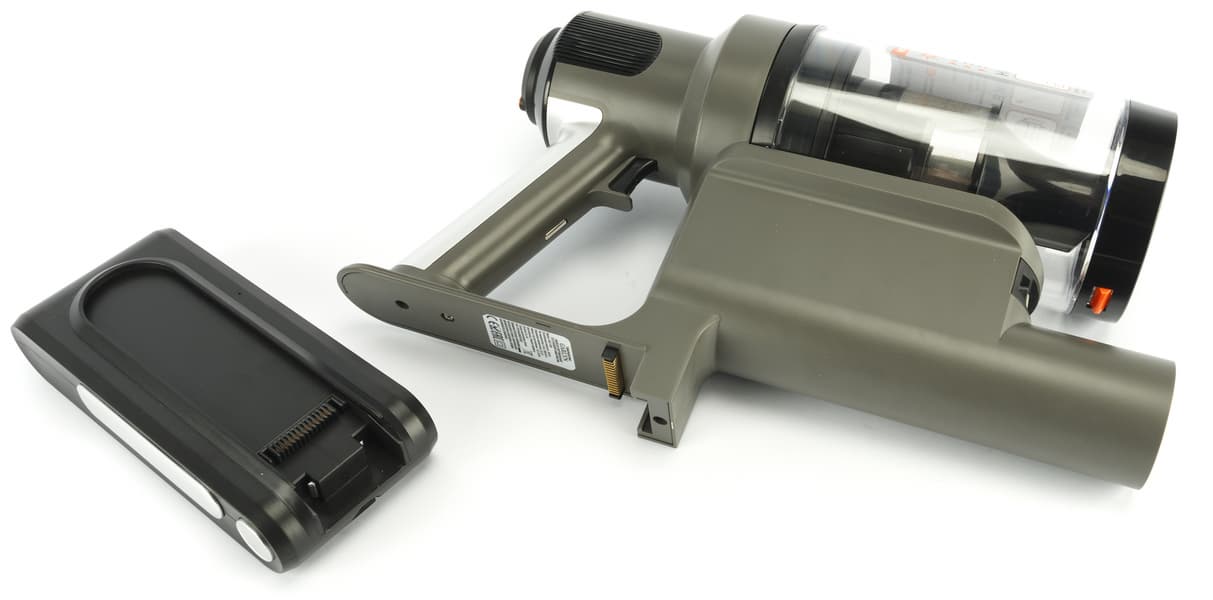 Литий-ионная батарея (2500 мА·ч, 25,2 В) традиционной формы пристегивается к пылесосу снизу. Она подключается к устройству с помощью 10-контактного разъема. Любопытно, что в передней части корпуса есть круглый разъем для сетевого адаптера, которого нет: эта модель заряжается только на базовой станции и не комплектуется дополнительным источником питания. Вероятно, в конструкции использован типовой аккумулятор — так производителю оказалось проще.