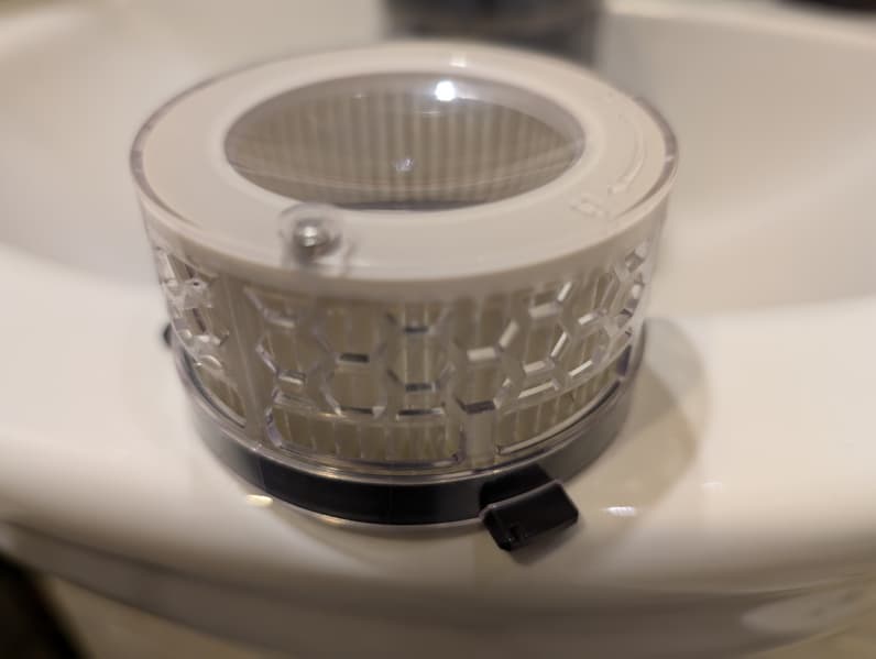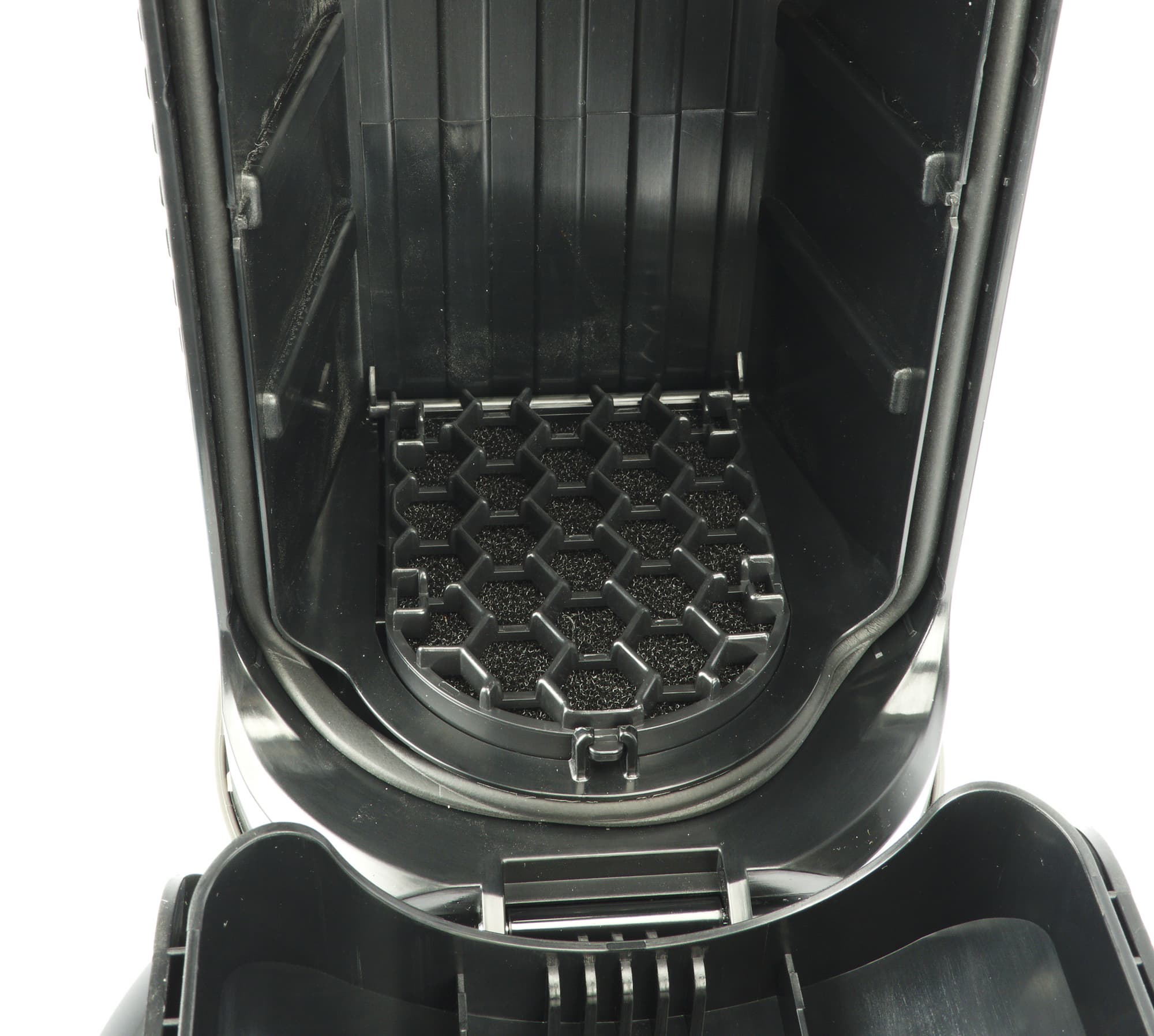 Поток воздуха из циклона попадает на предварительный фильтр из голубого поролона, после чего проходит через цилиндрический HEPA-элемент. Производитель сообщает, что здесь применен фильтр класса H13, задерживающий до 99,95% частиц размером более 0,06 микрон.