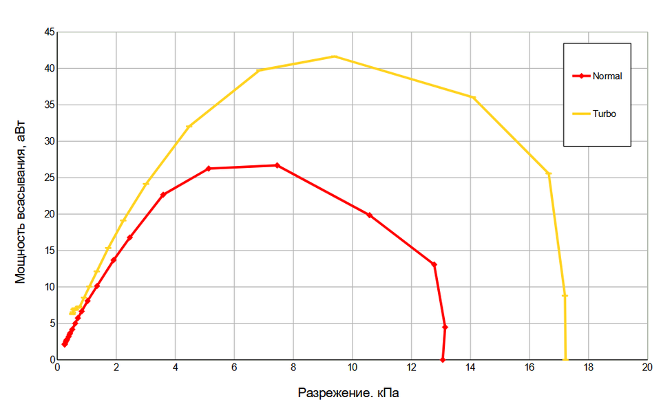 Мощность всасывания (что это такое и как ее измеряем, описано в отдельной статье) мы определяли при работе пылесоса без трубы и насадок, в обоих режимах. Зависимость мощности всасывания от создаваемого разрежения приведена на графике ниже: