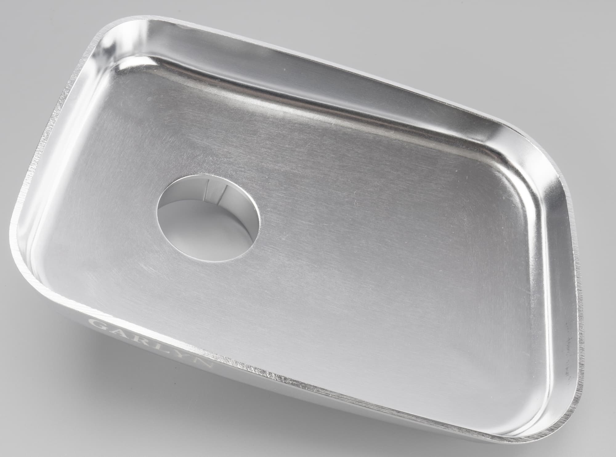 Вместительный лоток для подачи подготовленных продуктов сделан из алюминия, а толкатель — из пластика.