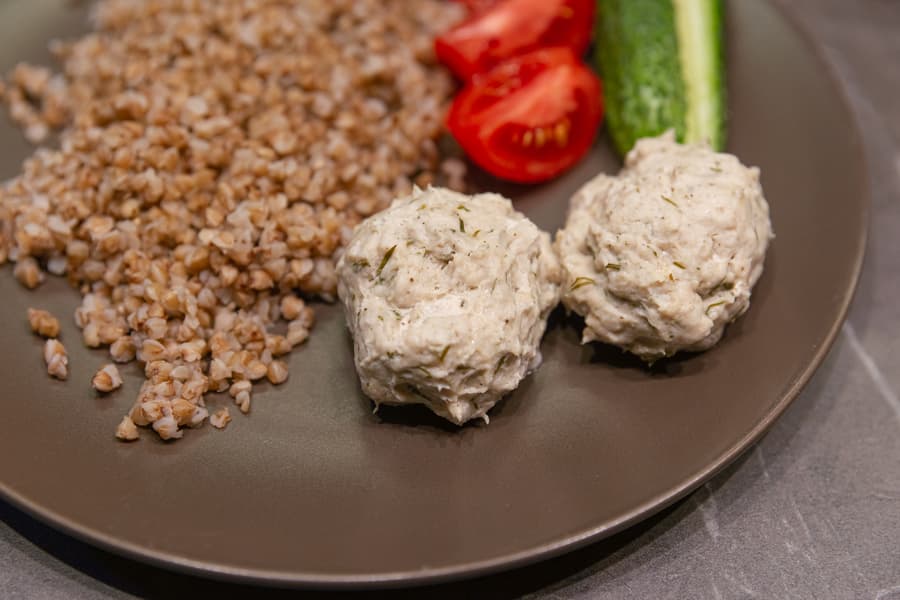 Фарш из индейки смешали с измельченным укропом, солью и специями и сформировали будущие котлеты. В чашу положили 250 г промытой гречневой крупы, залили 500 мл воды, посолили и включили программу Пар. Сверху поставили контейнер для варки и разместили в нем котлеты. В один лоток поместилось 350-380 г. Всё приготовилось одновременно. Каша получилась рассыпчатой, а котлеты — сочными.