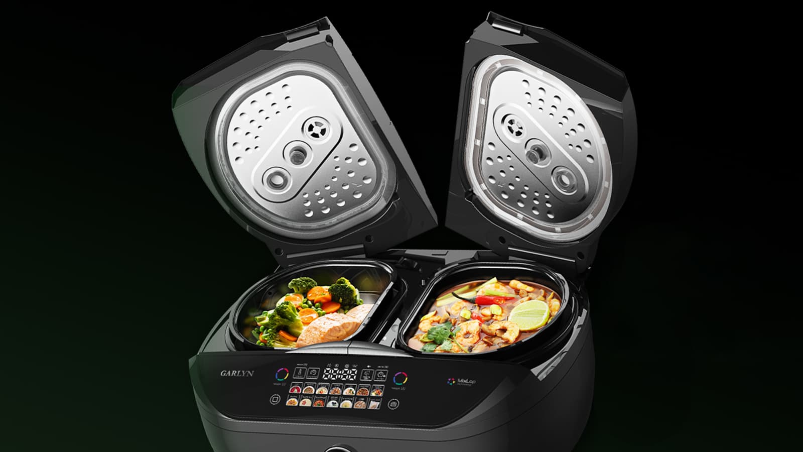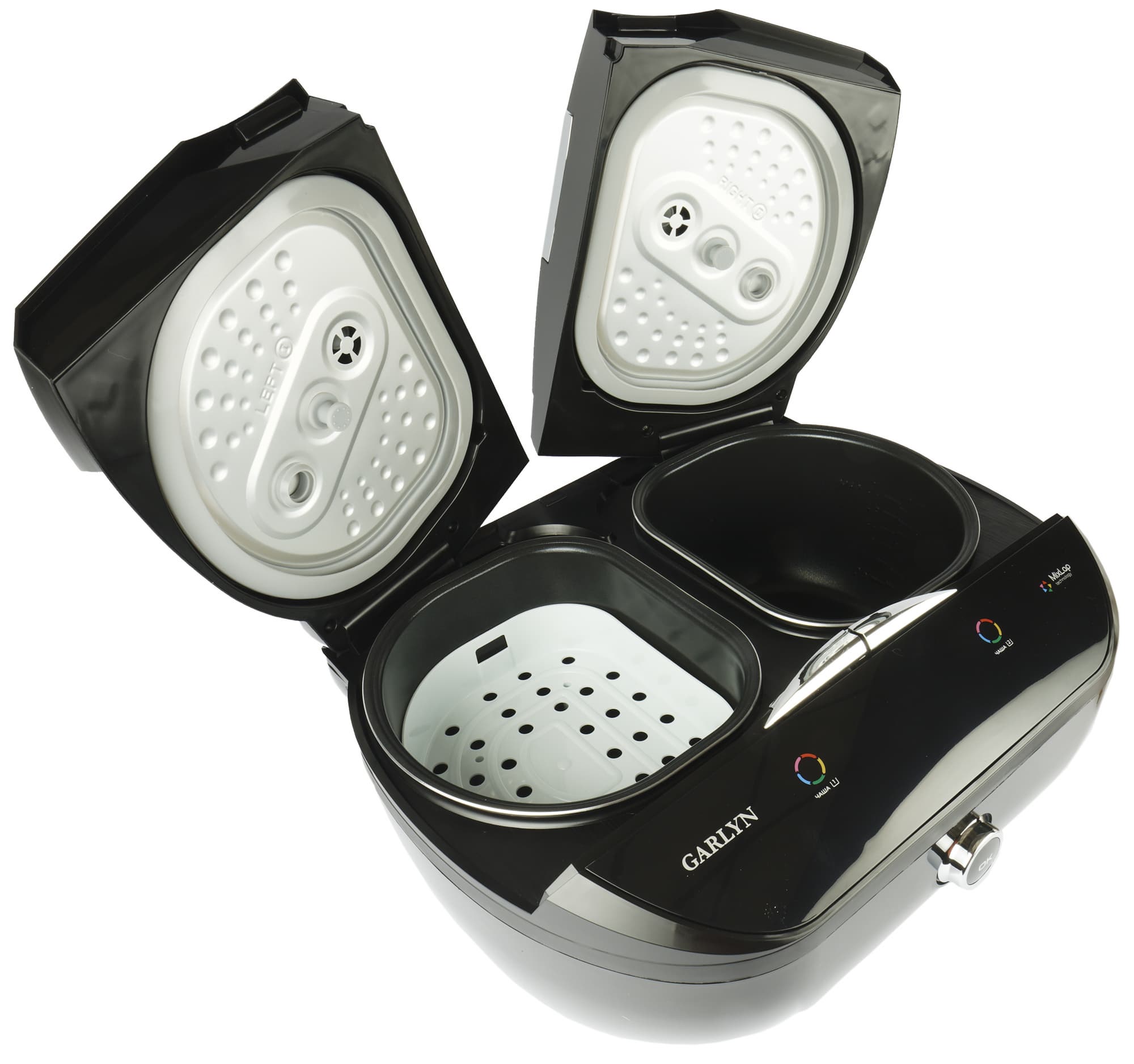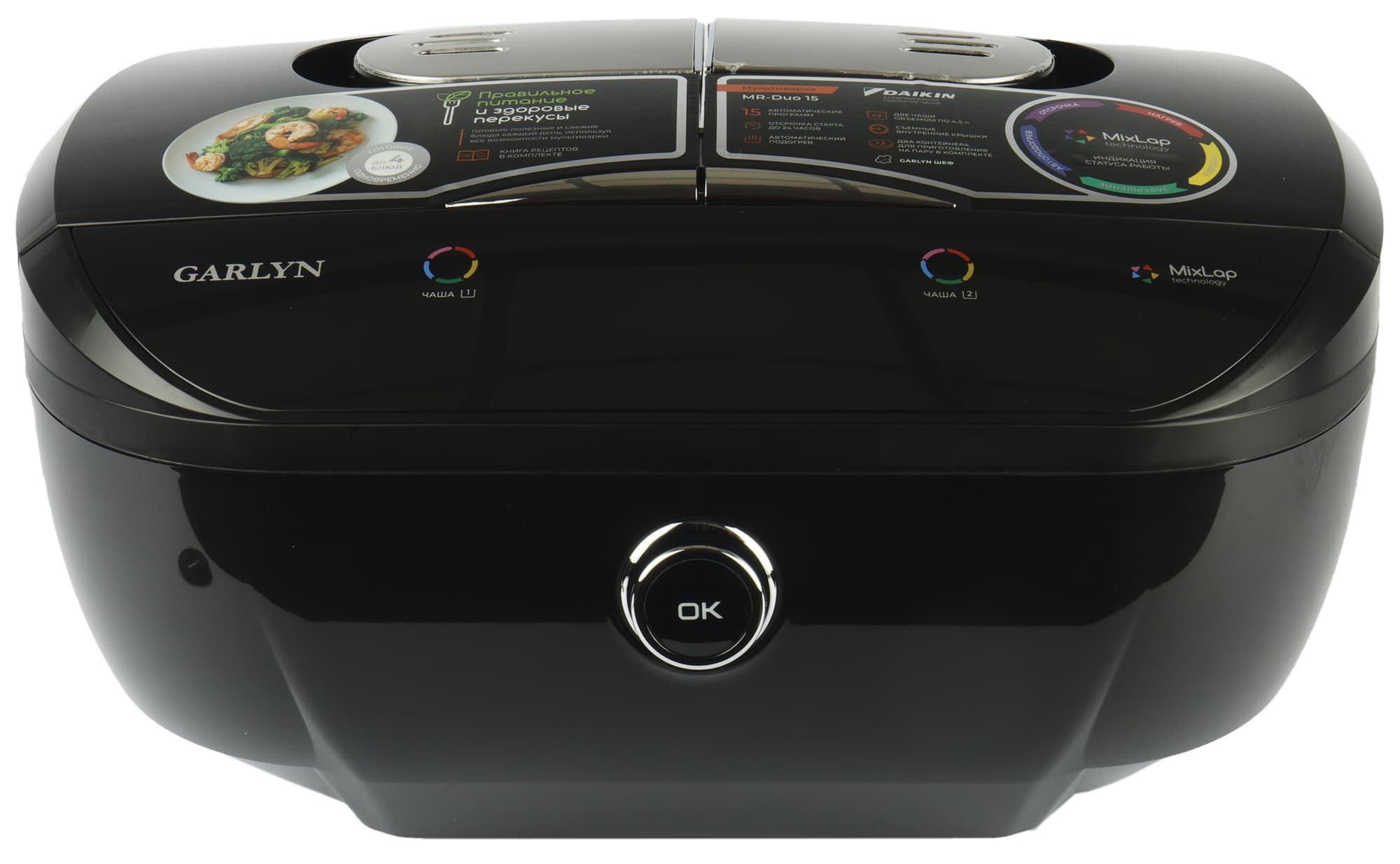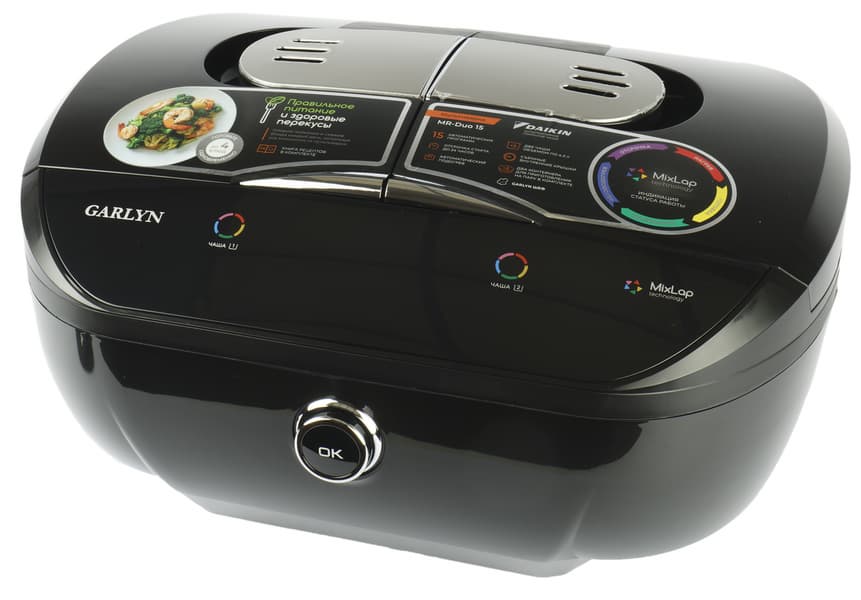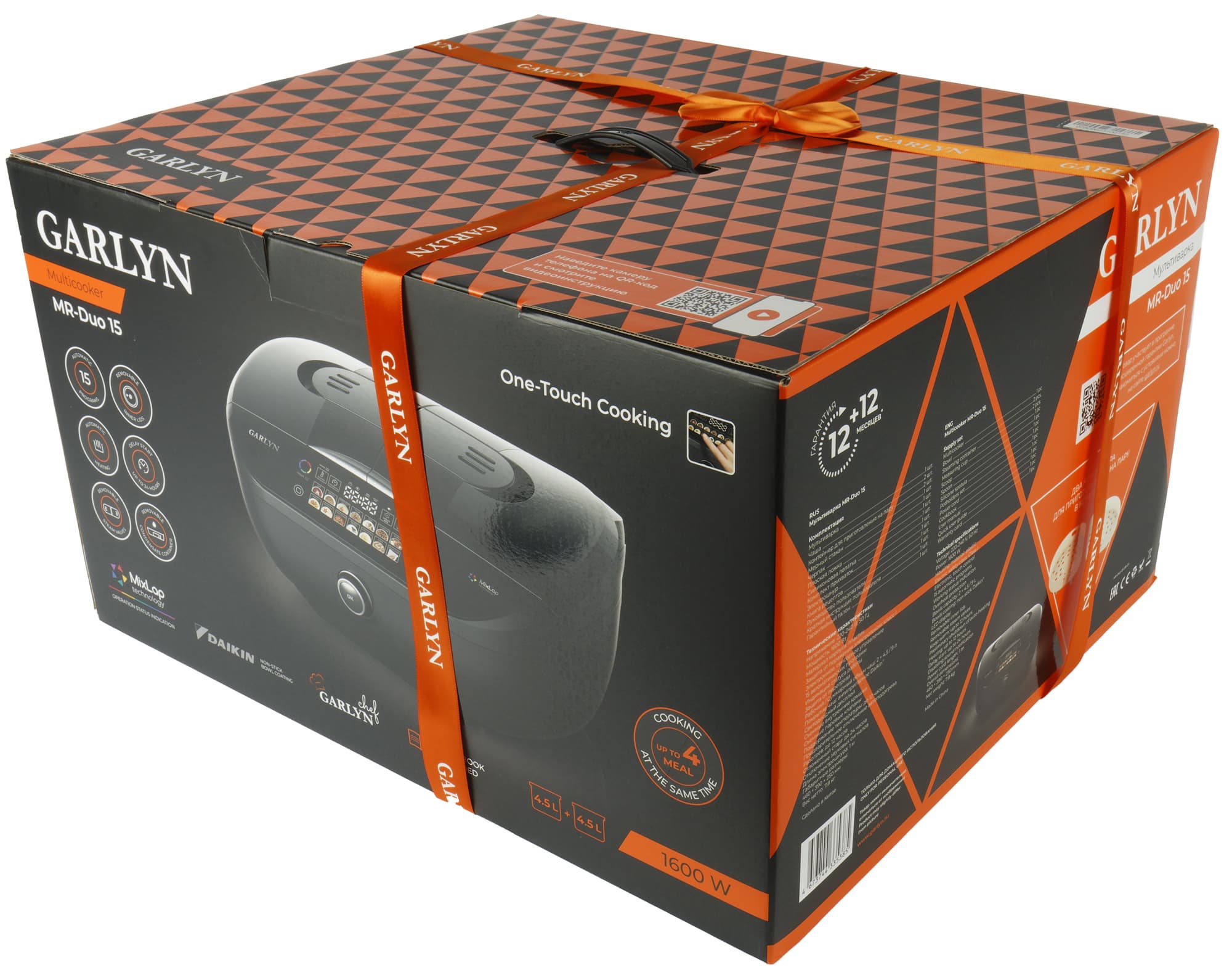 Мы уже тестировали мультиварки с 2 чашами, но столь крупных приборов нам, пожалуй, еще не встречалось. Знакомьтесь: Garlyn Mr-Duo 15, мультиварка с чашами аж по 4,5 литра, которая может справиться с приготовлением сразу нескольких блюд, причем даже не двух, а четырех, ведь помимо чаш в комплекте идут еще и два контейнера для приготовления на пару́.