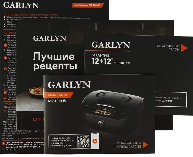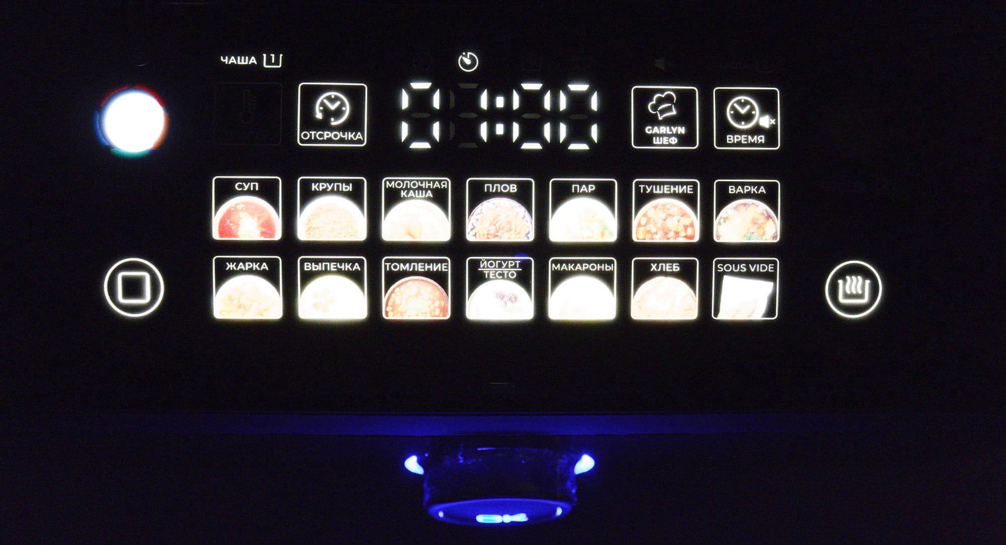 | Программы | 15: суп, крупы, молочная каша, варка, жарка, приготовление на пару́, выпечка, тушение, томление, плов, йогурт/тесто, макароны, хлеб, sous vide, Garlyn шеф |
