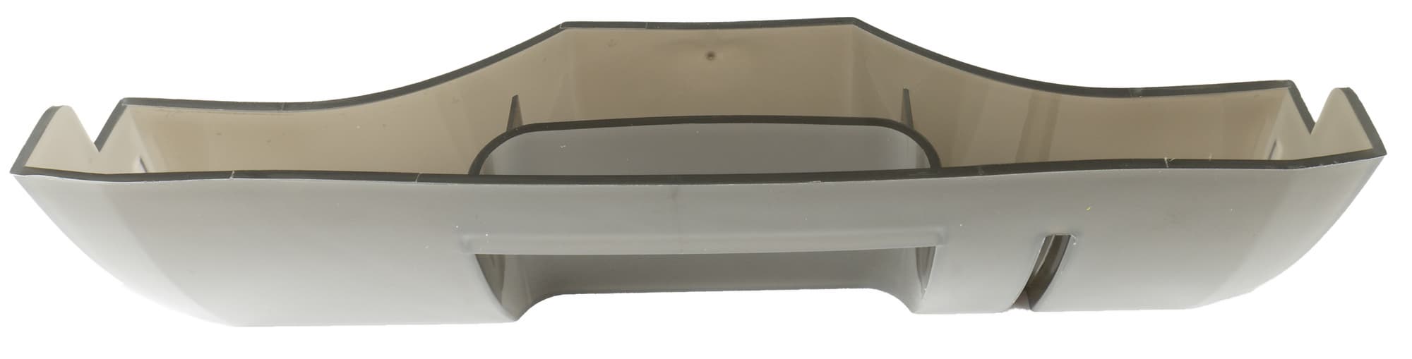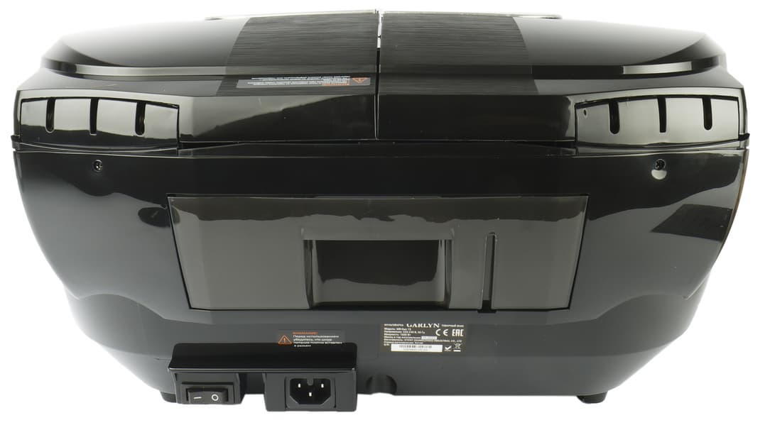 С задней стороны сверху мы видим крепления петель крышек, в самом низу расположен небольшой шильдик с краткой технической информацией об устройстве, разъем для шнура электропитания и кнопка включения/выключения, а посередине установлен широкий плоский контейнер из полупрозрачного серого пластика, предназначенный для сбора конденсата во время готовки.