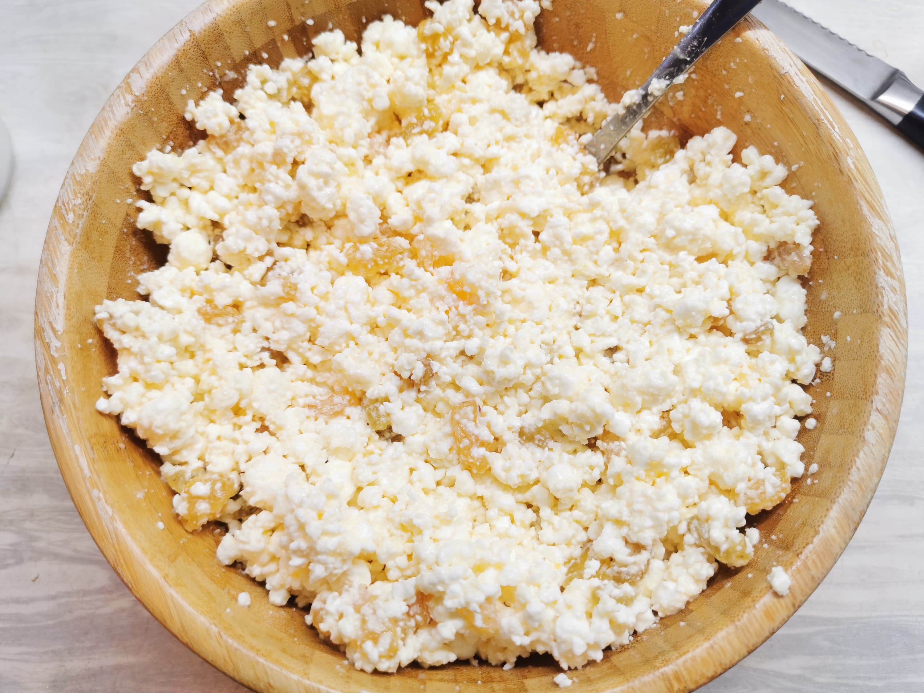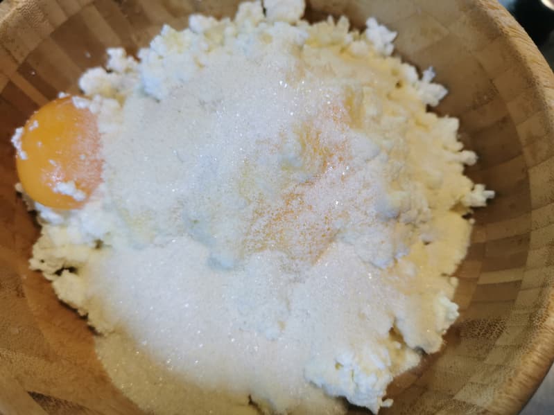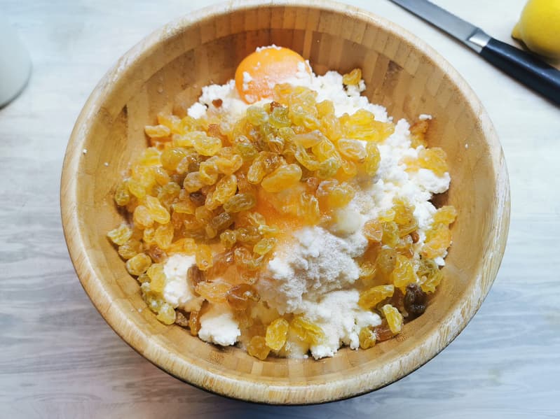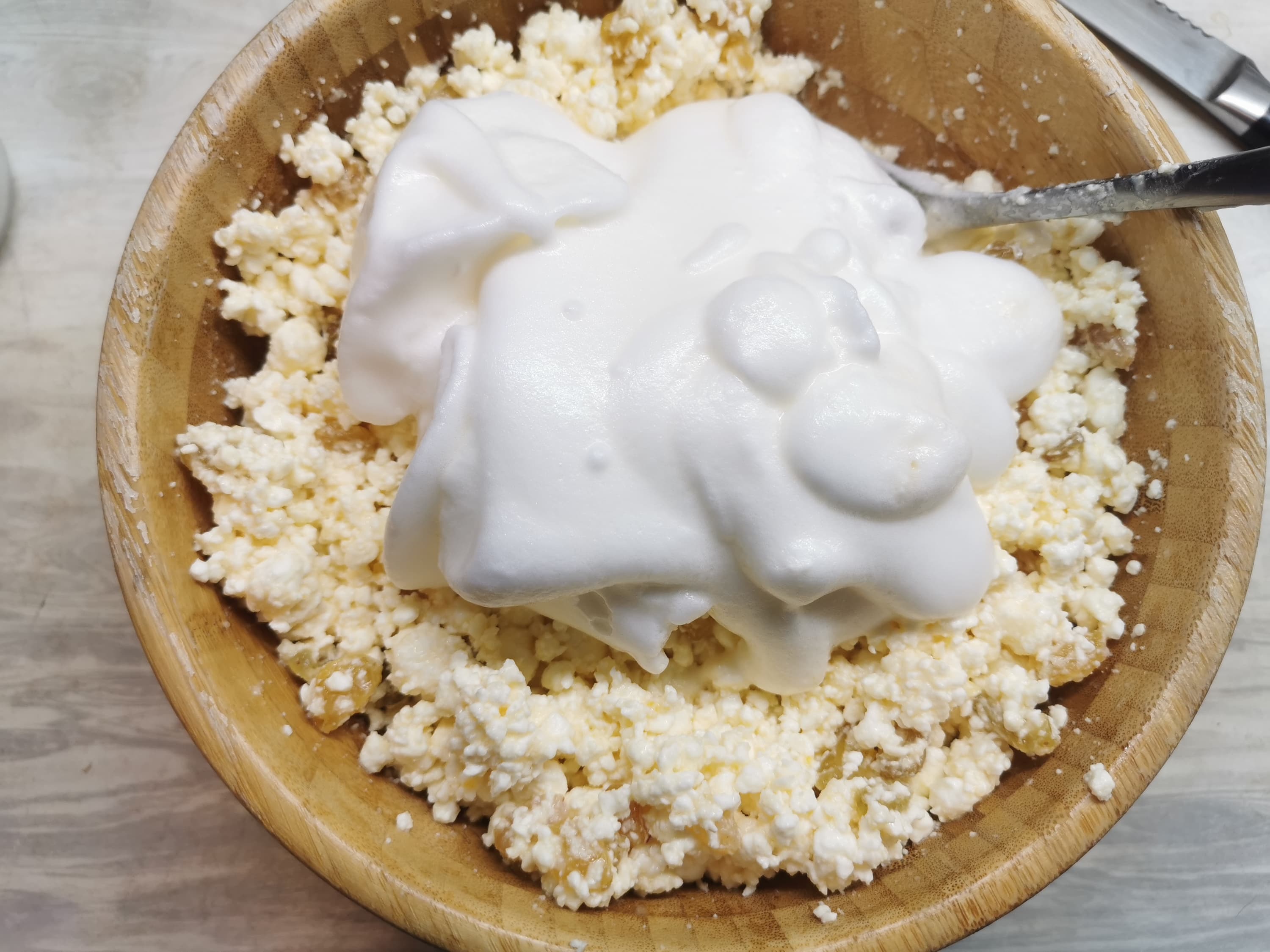 Изюм, творог, желтки, манную крупу и сахар хорошенько перемешали. После чего добавили туда белки и перемешали еще раз.