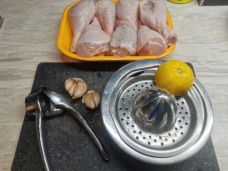 Для приготовления куриных ножек нам понадобились сами ножки, 30 г лимона, 15 г чеснока, 70 мл растительного масла, соль и специи (мы взяли карри и копченую паприку).
