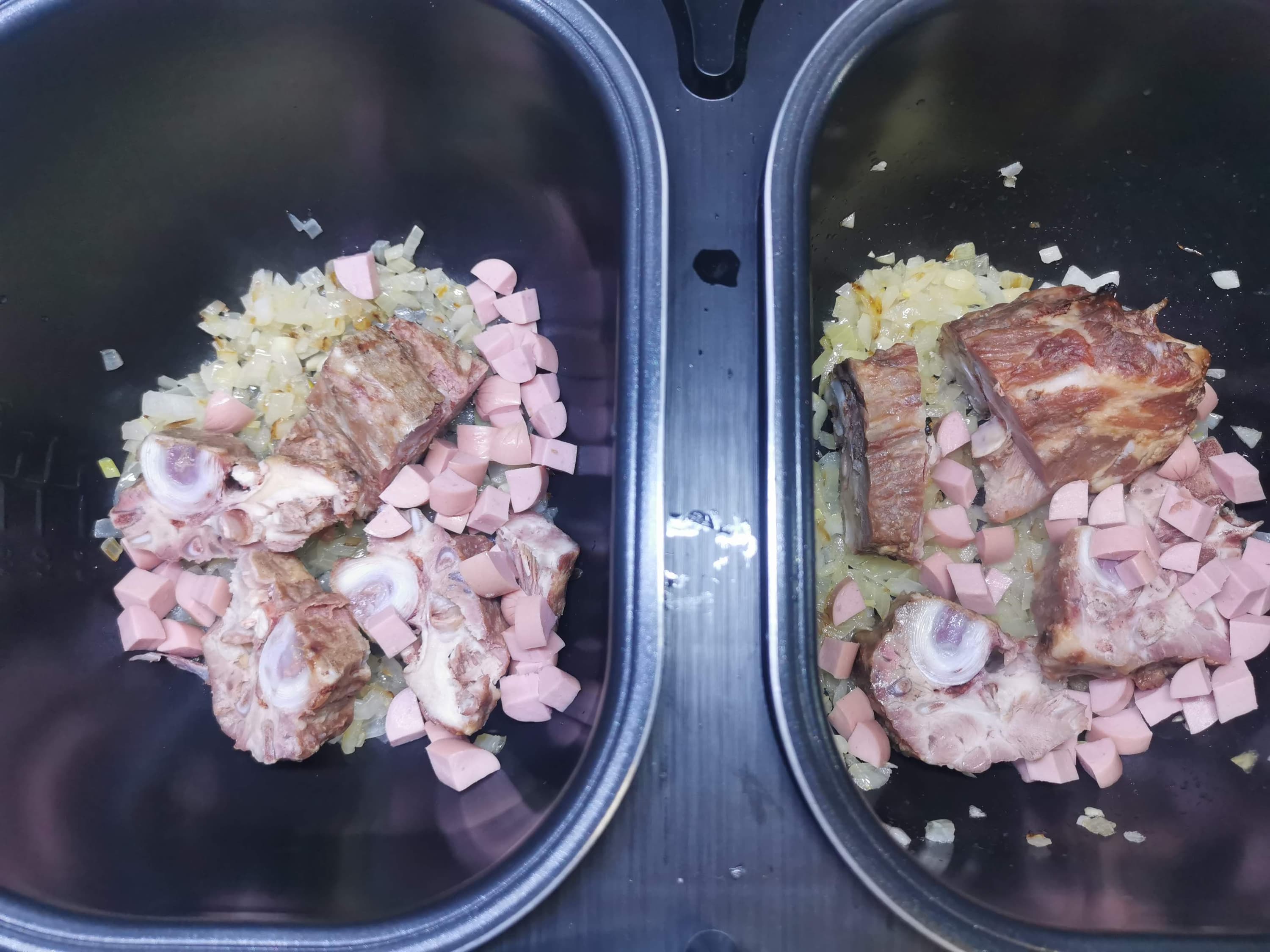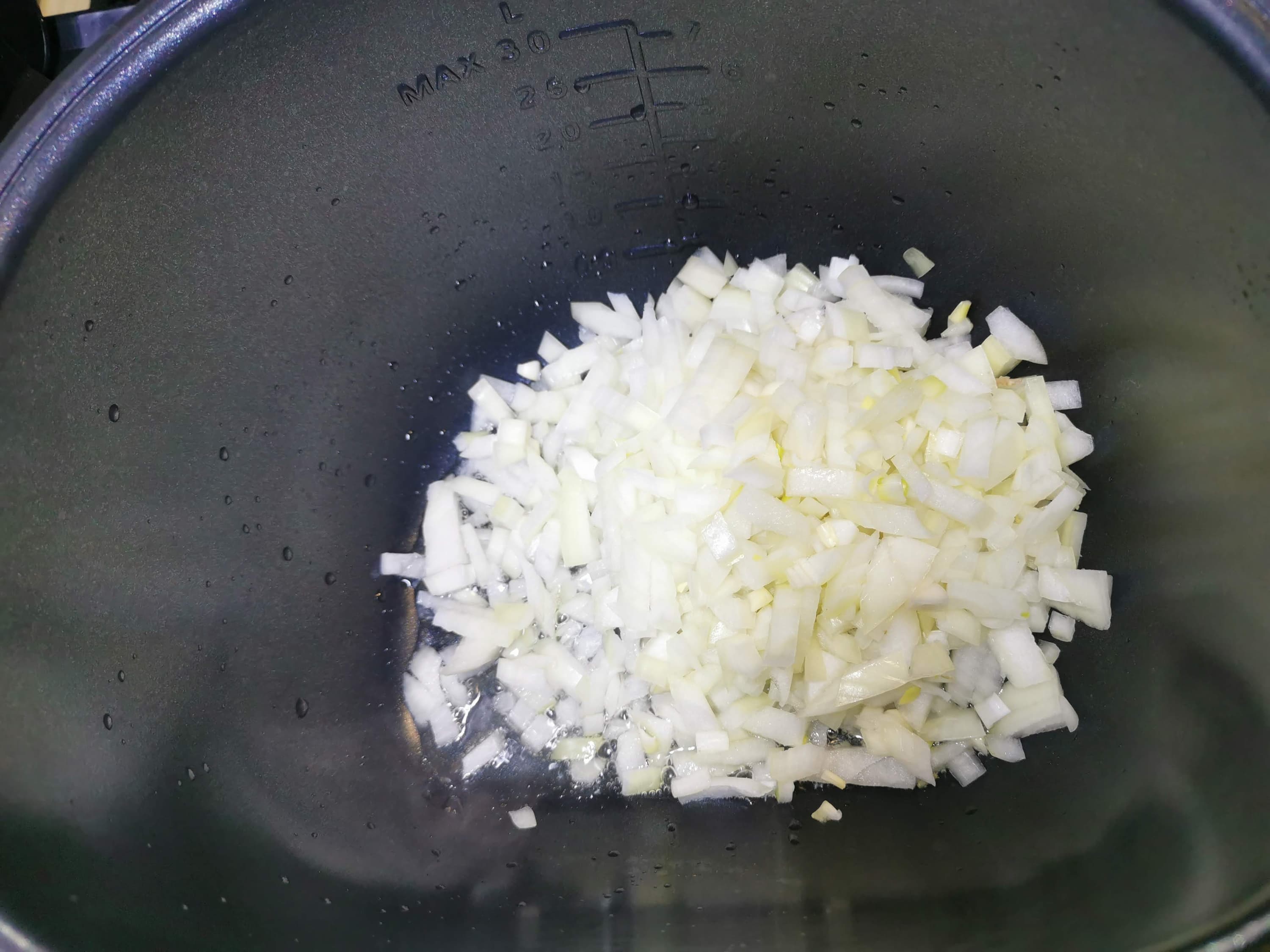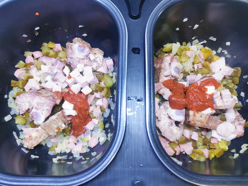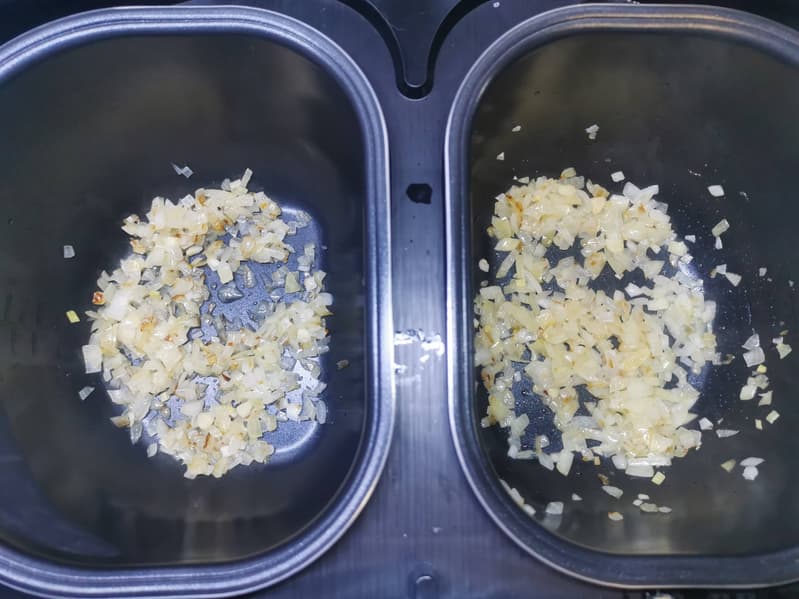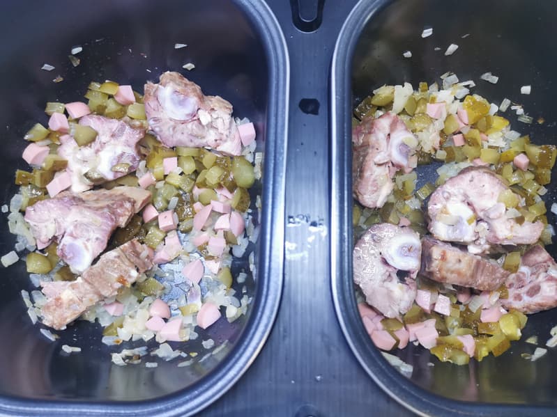 Для обжаривания лука мы включили для первой чаши программу «Жарка» на 5 минут и добавили в нее растительное масло. По окончании обжарки распределили лук поровну по обеим чашам.