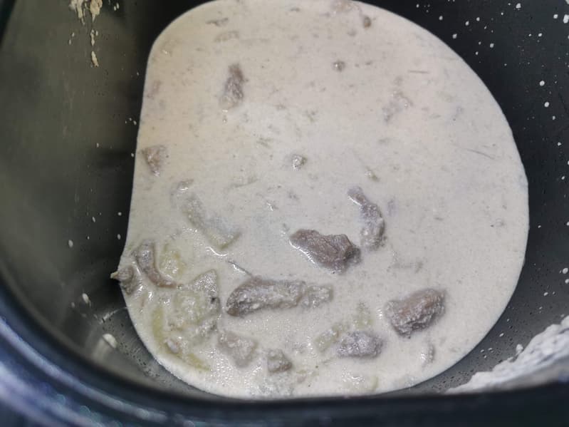 Добавили сливки, молоко, соль и перец. Следуя инструкции, выбрали программу «Тушение», указали время готовки 40 минут.
