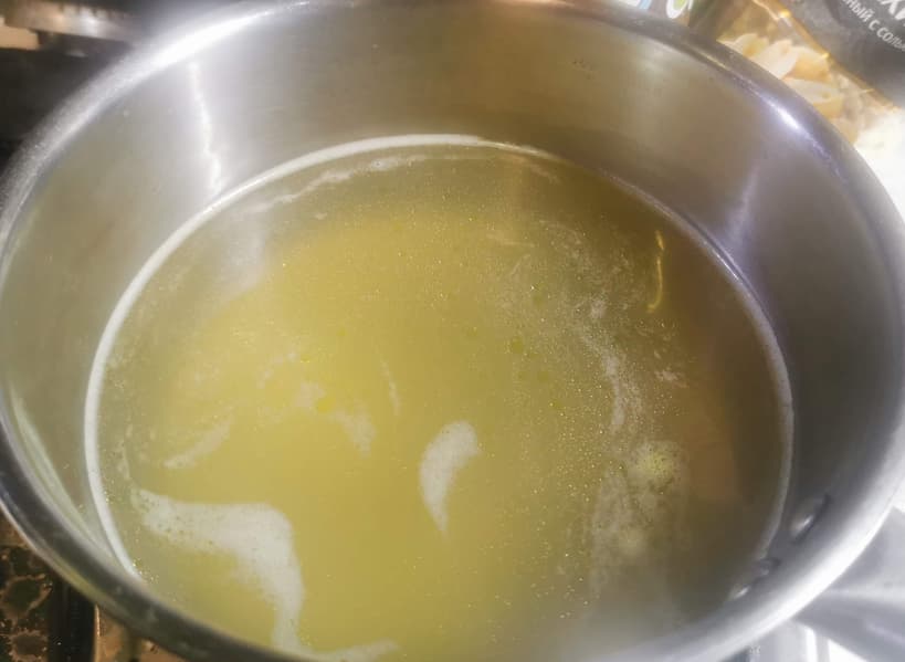 Мясной бульон для таких целей у нас всегда имеется в морозилке, поэтому мы просто заранее подогрели его на плите.