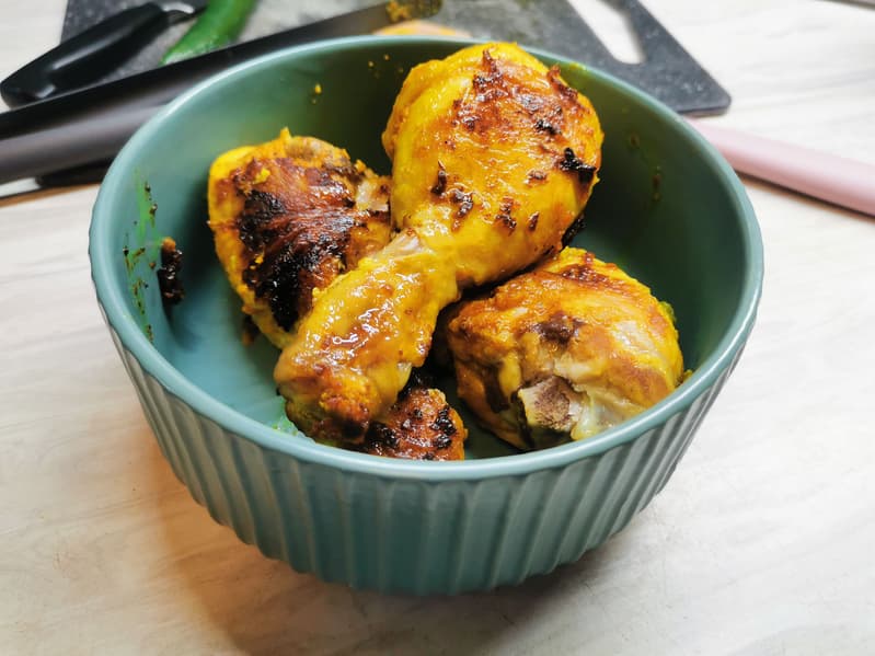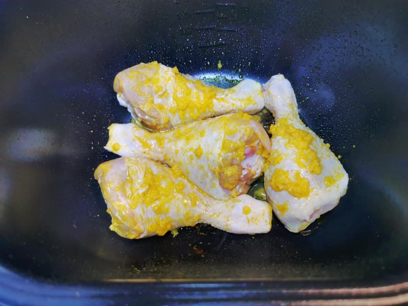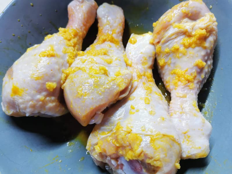 К соку лимона с чесноком мы добавили карри с паприкой и хорошенько изваляли помытые и обсушенные куриные голени в получившейся смеси. После этого поставили курицу на 2 часа в холодильник.