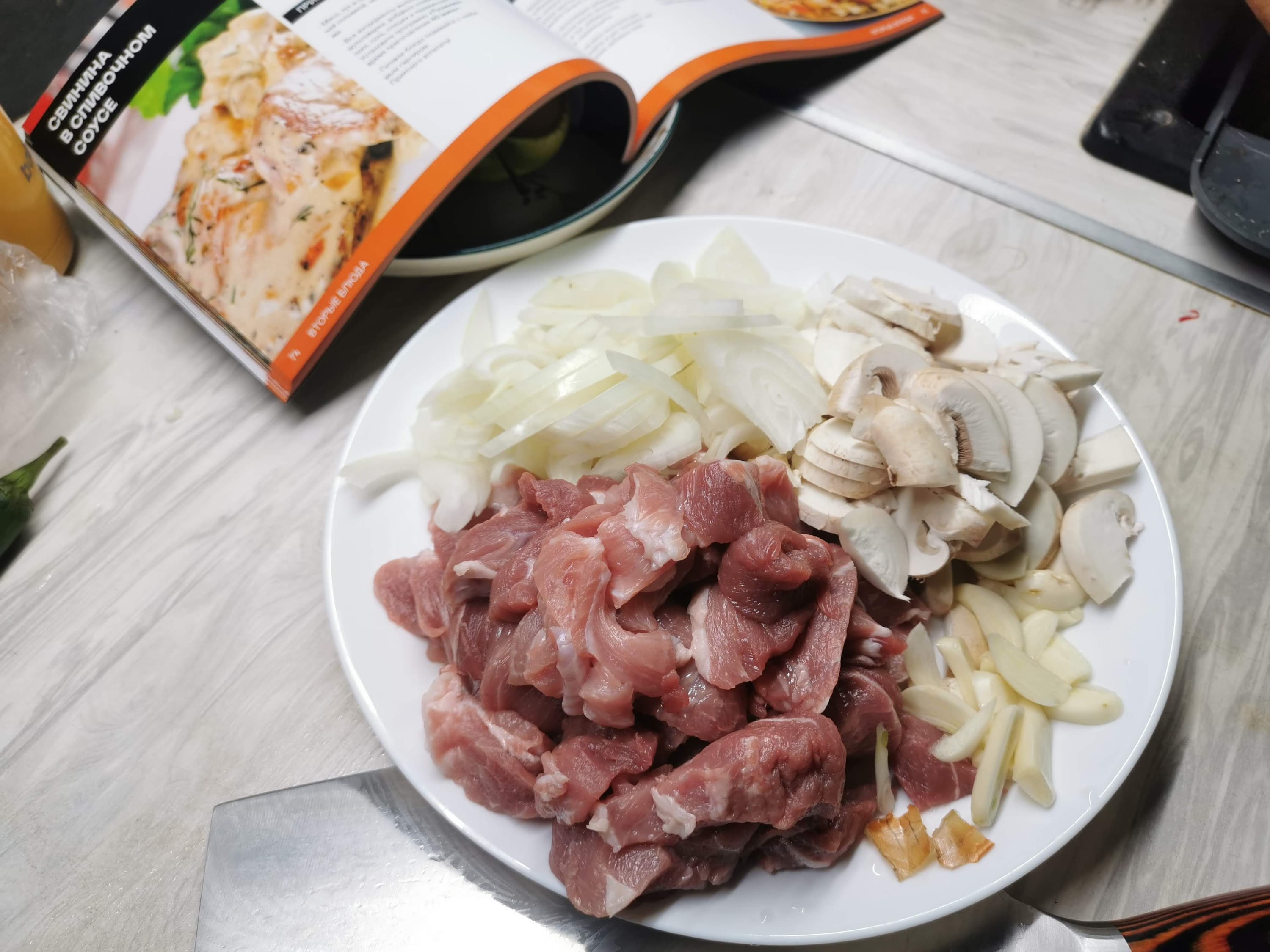 Для приготовления мяса в сливочном соусе по рецепту Garlyn нам понадобились: 600 г филе свинины, 100 мл молока, 100 г шампиньонов, 220 мл сливок 33%-ной жирности, 15 г чеснока, 150 г репчатого лука, соль и черный молотый перец.
