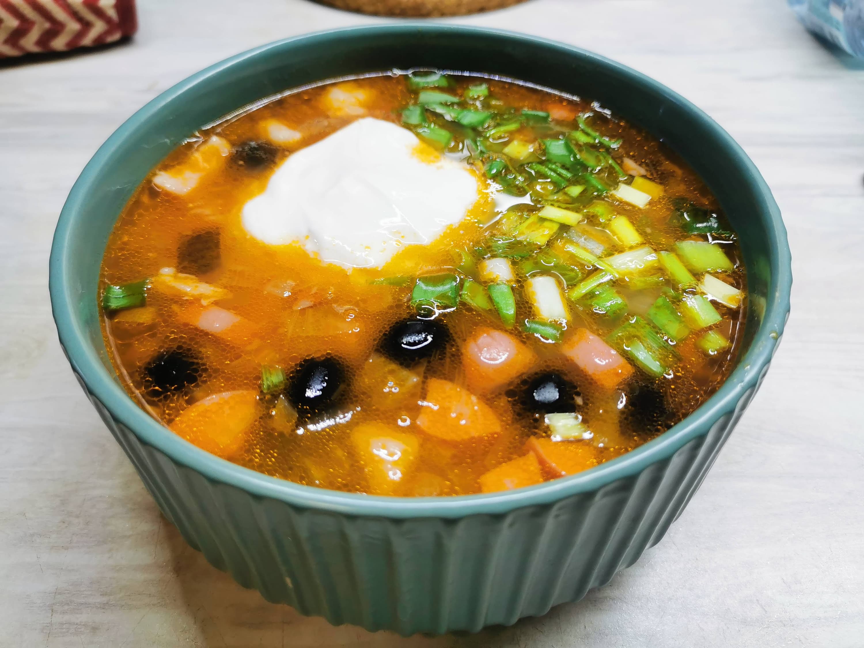 При подаче добавили в суп немного зелени, лимон и сметану. Получилось очень вкусно и сытно.