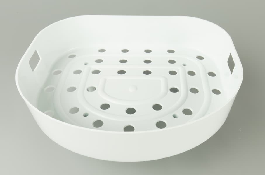 В комплекте идут 2 контейнера для приготовления на пару́ с отверстиями практически по всей их площади, ручками для удобного извлечения и установки, и четырьмя пластиковыми ножками для устойчивости внутри пустой чаши или друг над другом.