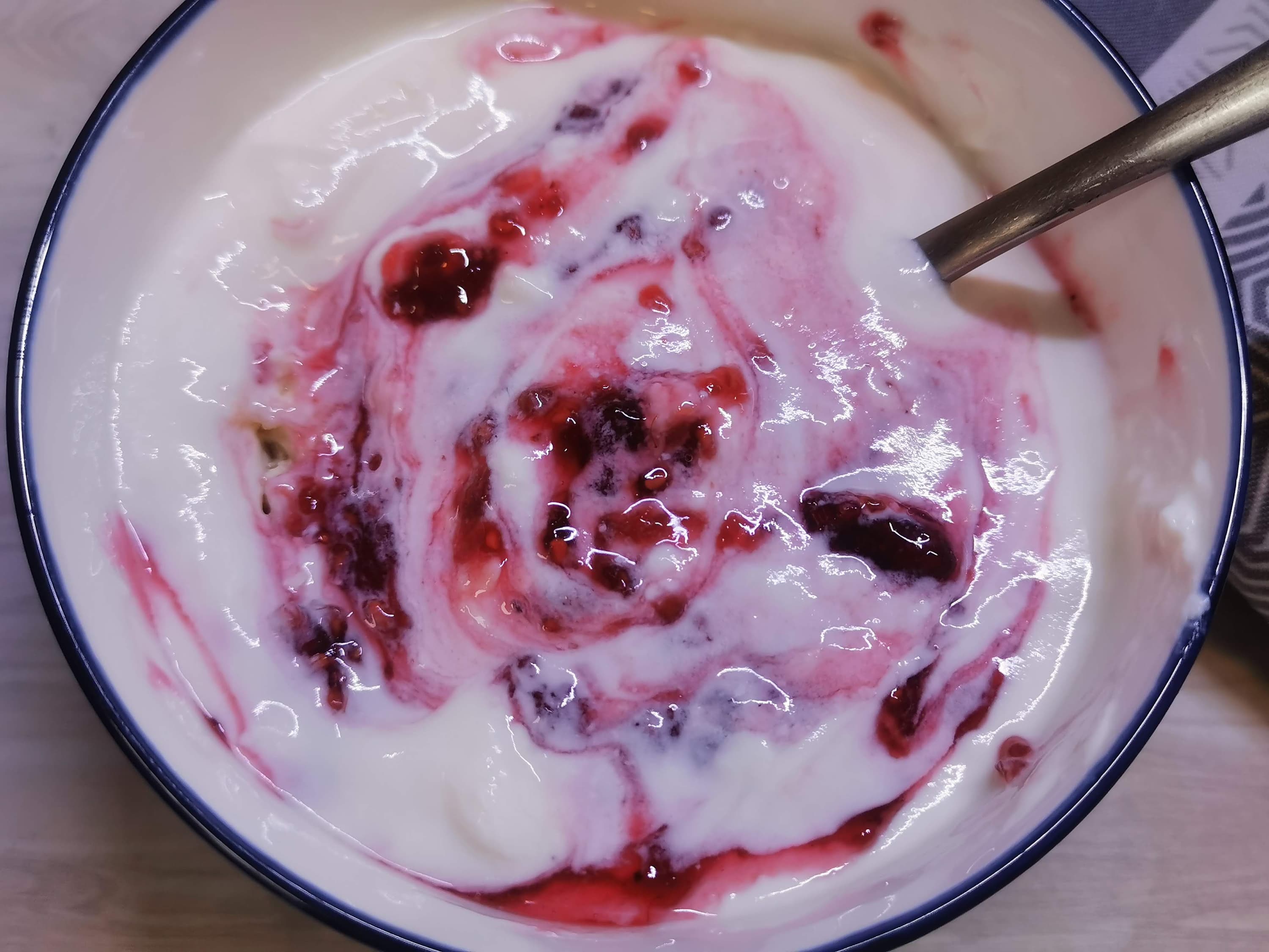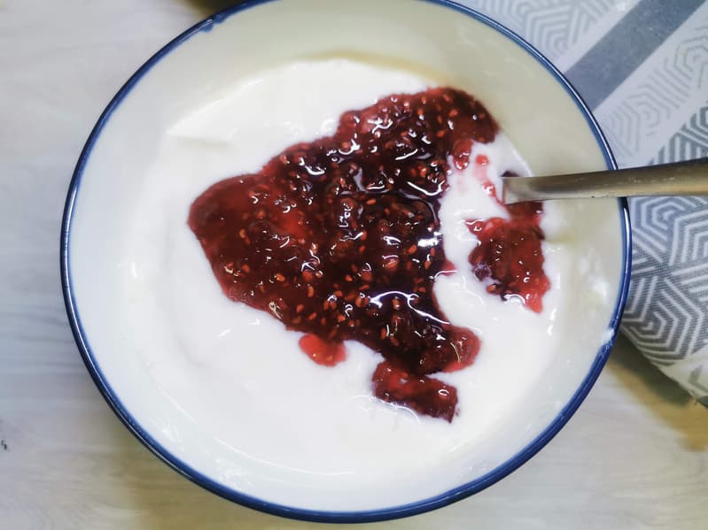 Для подачи к столу мы добавили в йогурт немного малинового варенья.