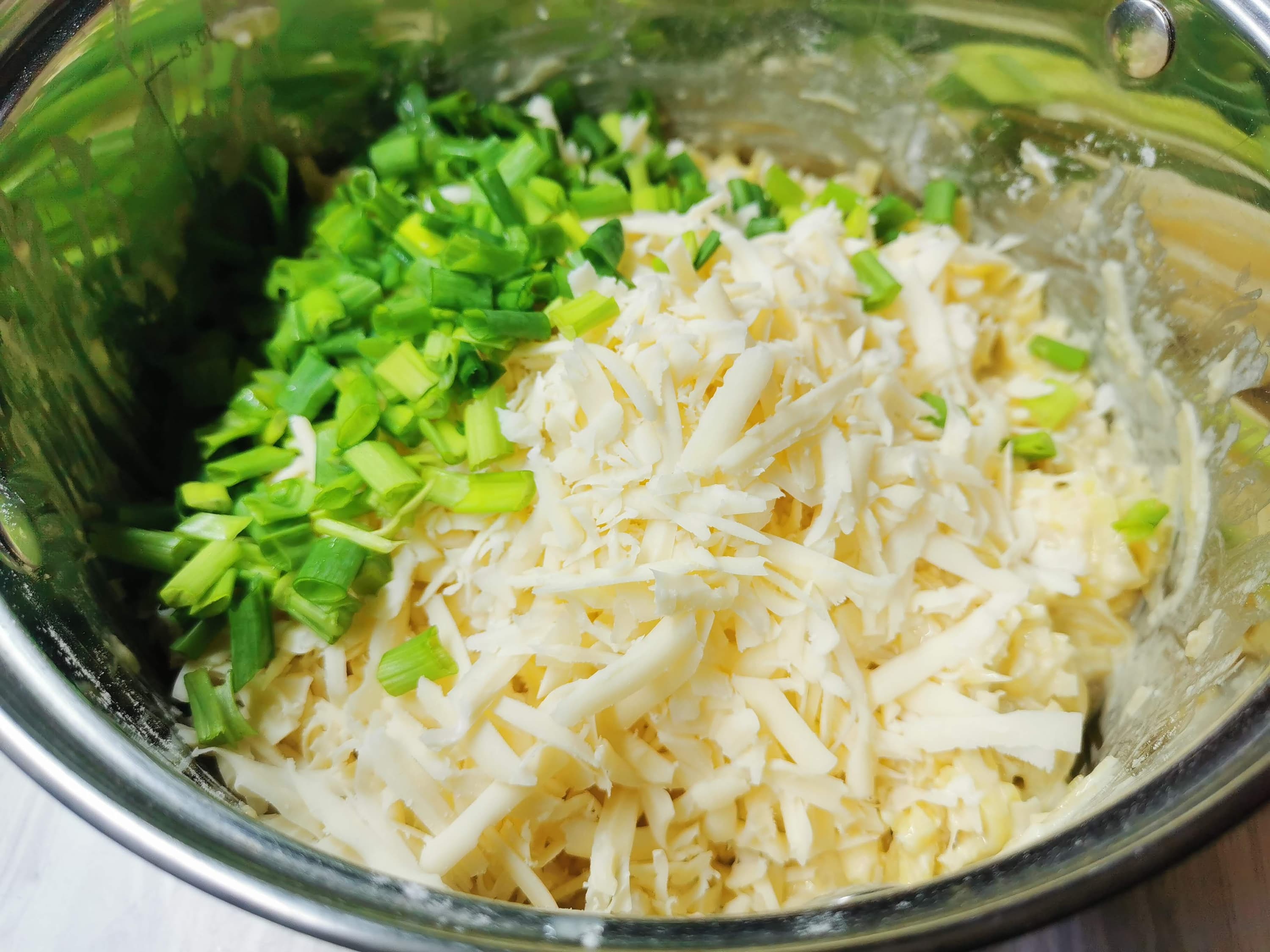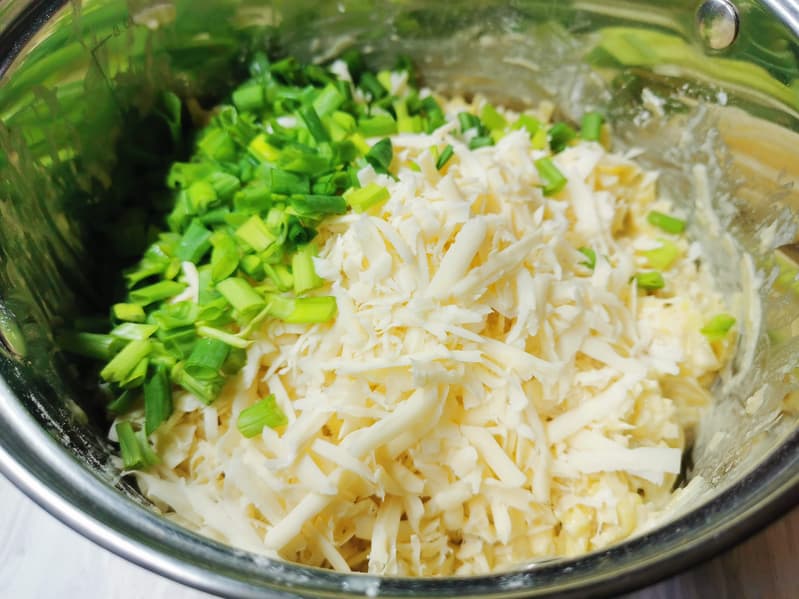 Для приготовления этого блюда нам понадобились: картофель 4 шт., зеленый лук 1 пучок, мука 250 г, яйцо 1 шт., масло сливочное 30 г, молоко 100 мл, сыр Маасдам 200 г, растительное масло 1 столовая ложка, соль и молотый черный перец.