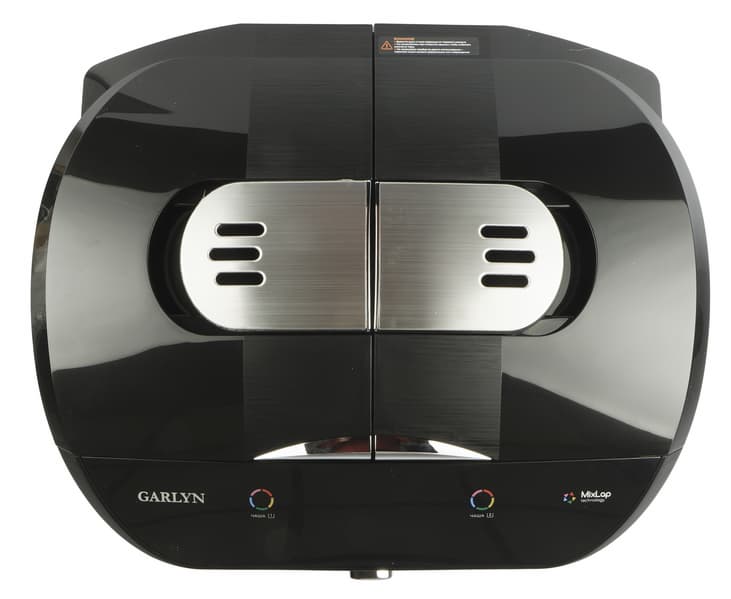Мультиварка Garlyn MR-Duo 15 имеет внушительные габариты, а своей формой и наличием крупной круглой кнопки спереди по центру, напоминает грудную часть костюма Железного человека. Корпус устройства выглядит современно и качественно. Независимые друг от друга крышки открываются наверх под углом почти 90 градусов, а благодаря тому, что их петли стоят под наклоном — в раскрытом виде прибор становится похож на огромного взлетающего жука.