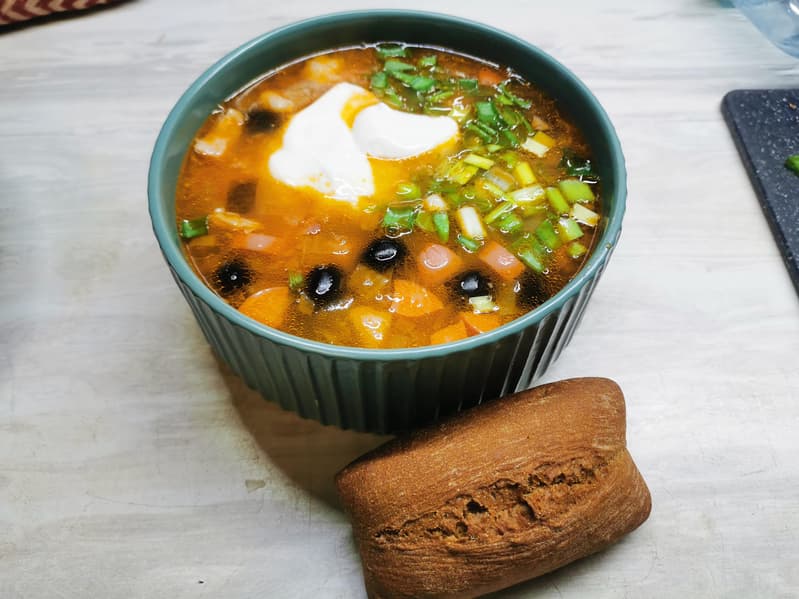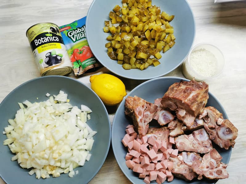 Для приготовления супа нам понадобились несколько видов мясных продуктов, мясной бульон, соленый огурец, репчатый лук, томатная паста, рис, маслины, лимон, соль и черный молотый перец. Мы взяли всех ингредиентов в два раза больше, чем предлагалось в рецепте из интернета, так как решили готовить суп сразу в двух чашах.