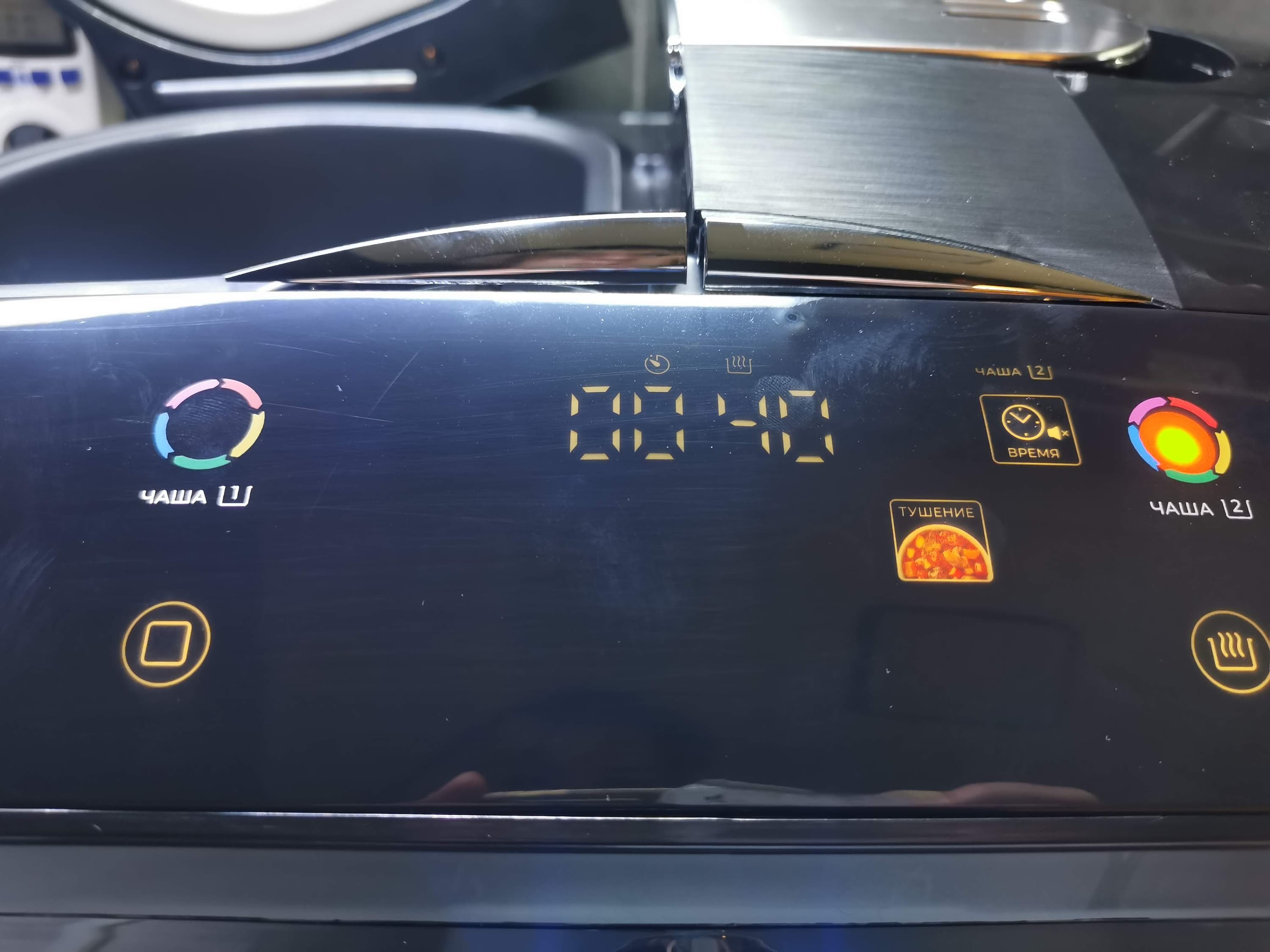 Нажимая кнопку с выбранной программой для каждой из чаш, мы увидим на дисплее только картинку, время и температуру этой программы приготовления. Нажав на кнопку другой чаши, мы соответственно увидим там программу, выбранную для нее.