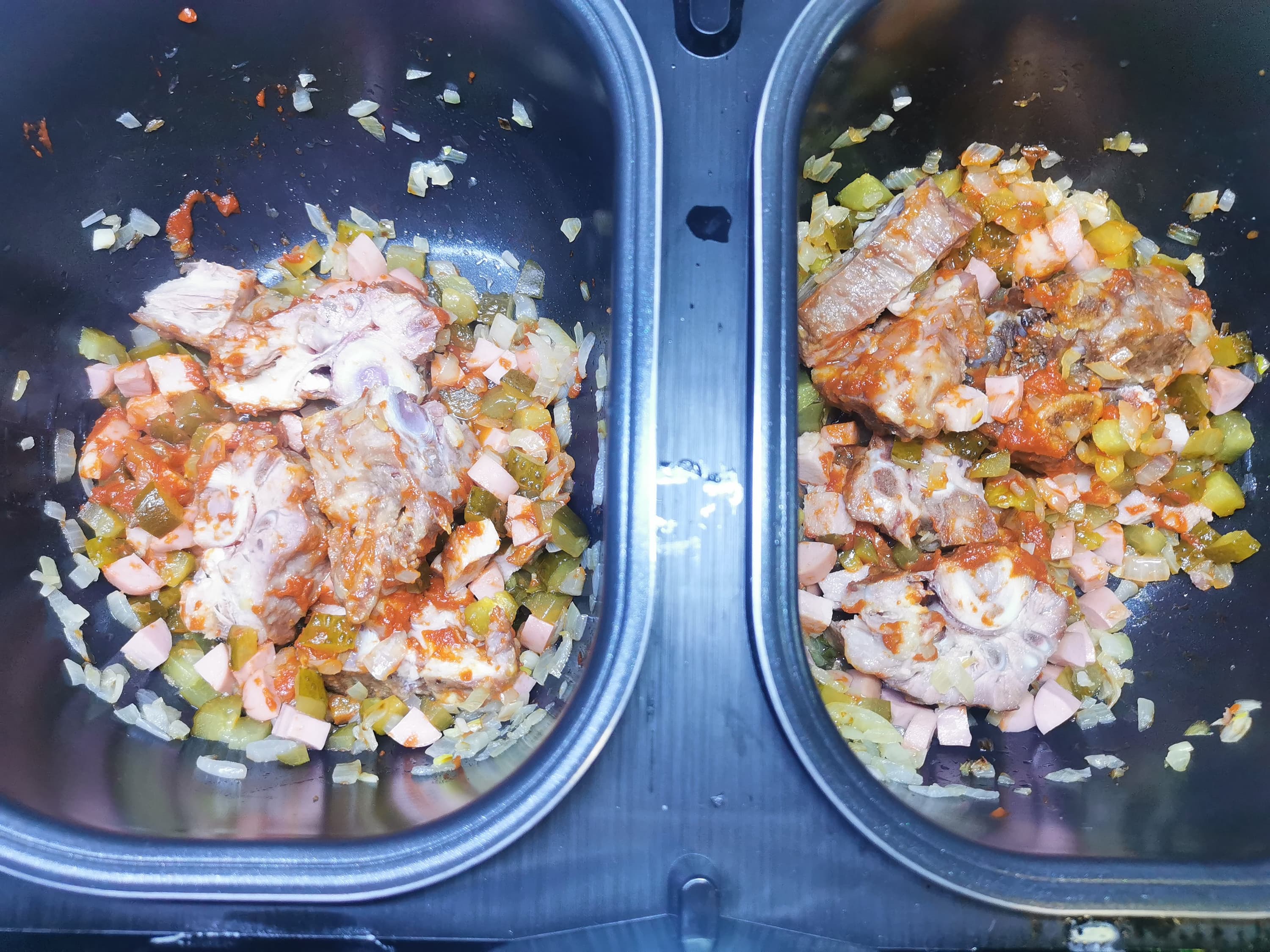 Нарезанные ингредиенты и промытый рис мы так же равномерно разделили по двум контейнерам, добавили томатную пасту, а после залили всё бульоном и водой 1 к 1.