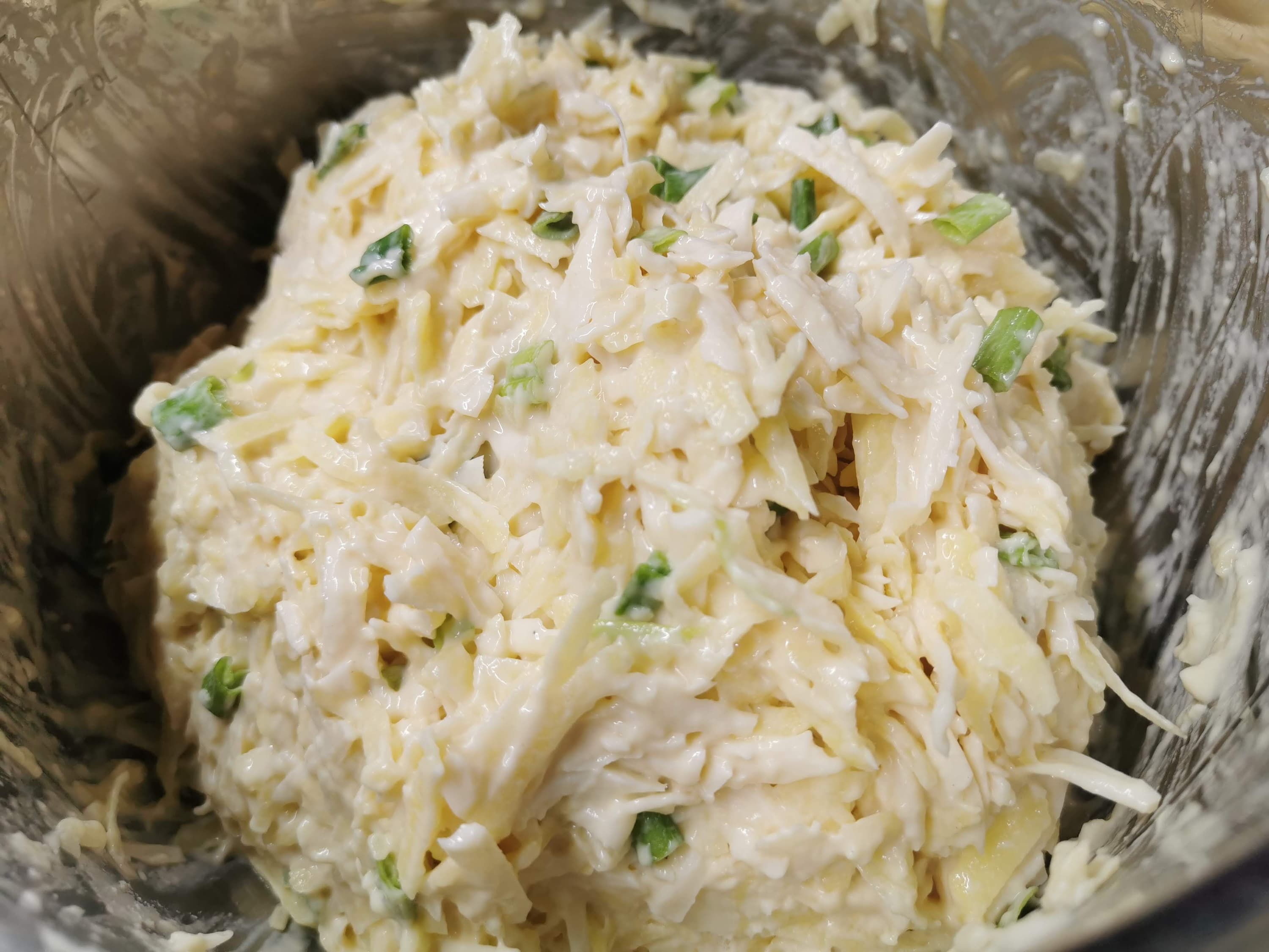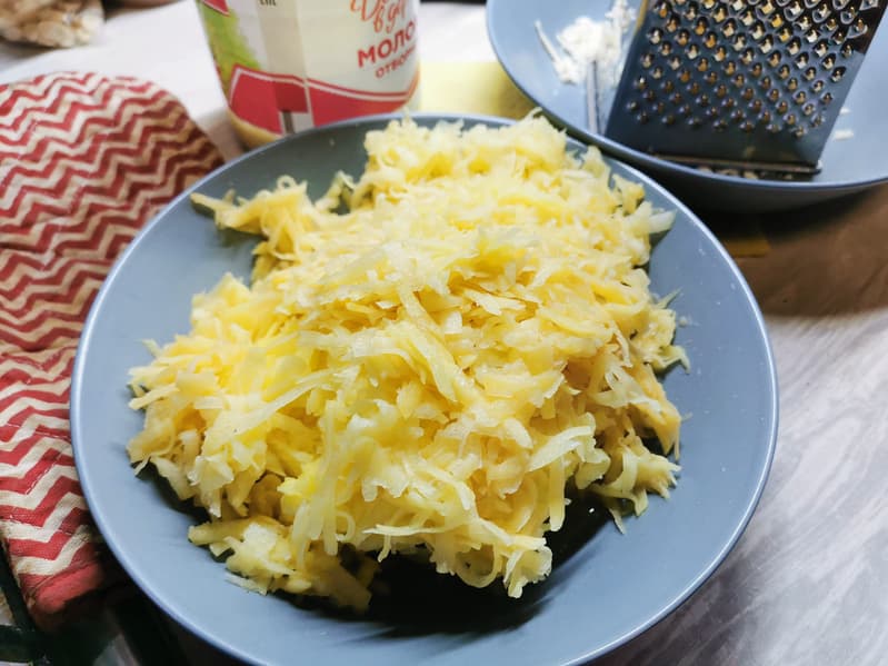 Мы натерли картофель и сыр на крупной терке, нарезали лук и смешали все ингредиенты в кастрюле.