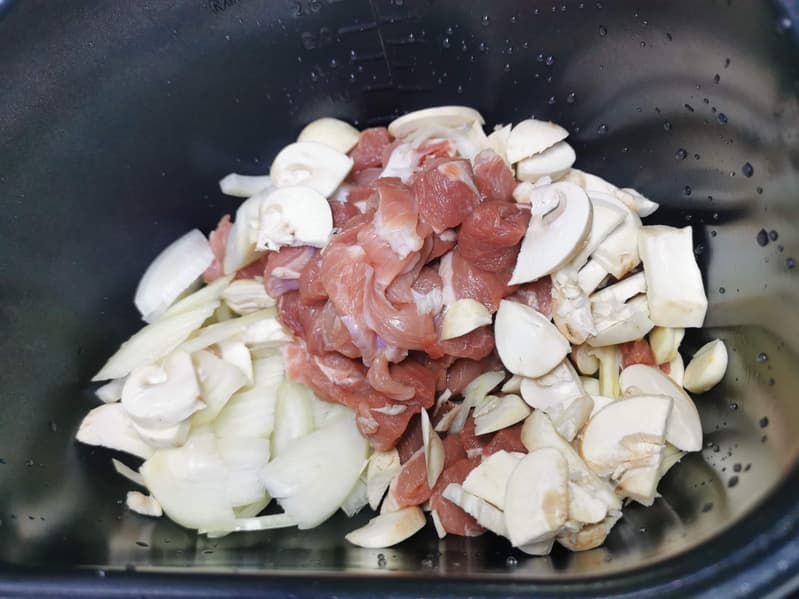 Мясо, лук, чеснок и грибы мы нарезали на небольшие кусочки и переместили все ингредиенты в чашу мультиварки.