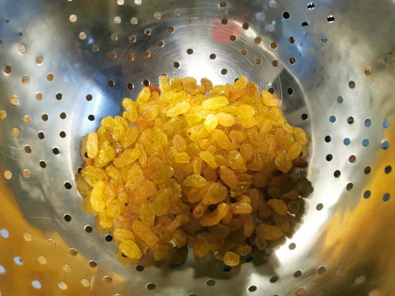 Изюм мы тщательно промыли, замочили на 10 минут в теплой воде и оставили подсыхать в дуршлаге.