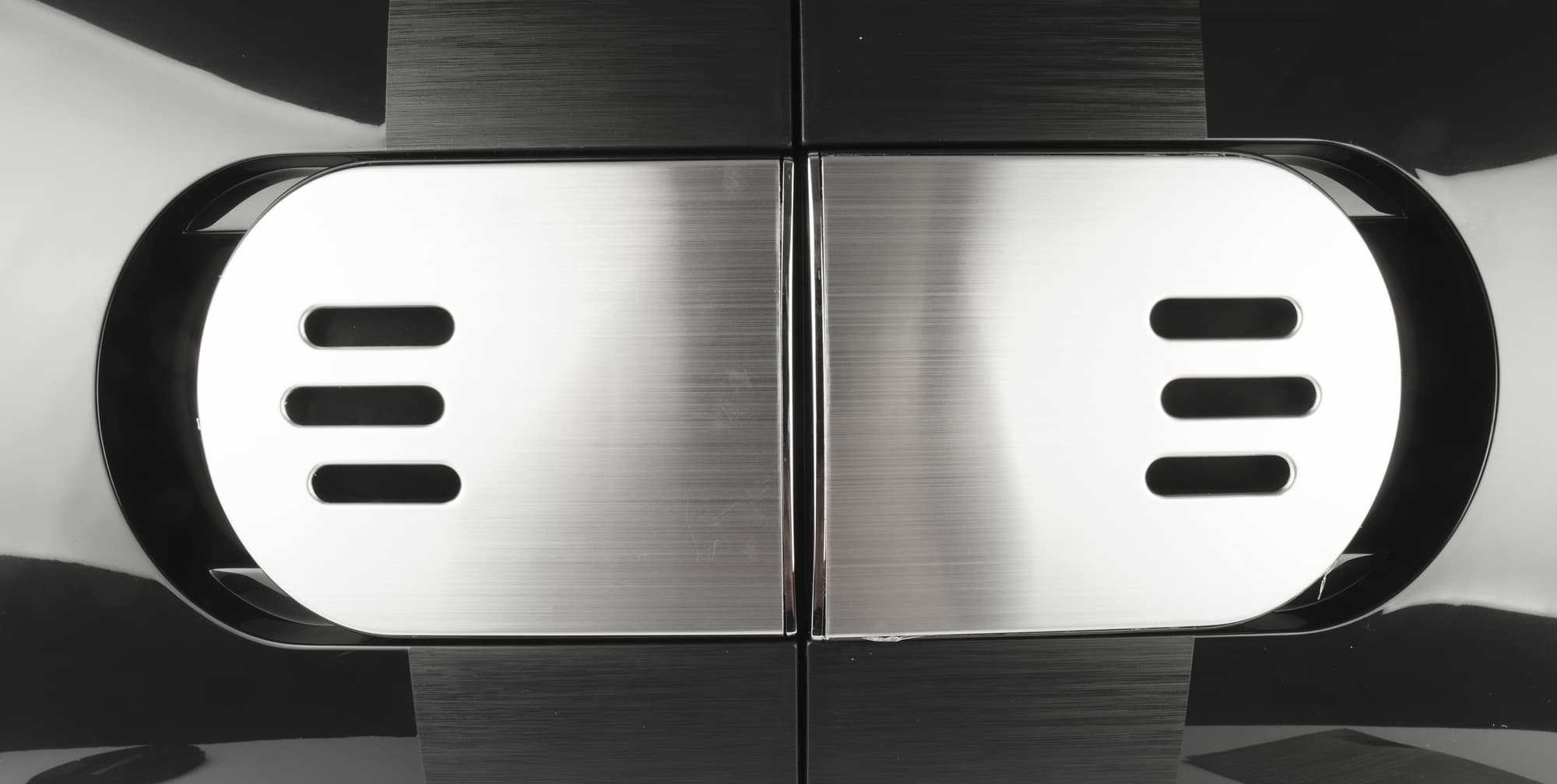 Обзор сверху дает нам рассмотреть крышки прибора и кнопки для их открывания. В центре каждой из крышек находятся клапаны для выхода пара. Не смотря на то, что выглядят они как ручки или кнопки, таких функций у них нет. Кнопками открывания крышек являются узкие пластиковые кнопки цвета металлик, находящиеся над панелью управления.