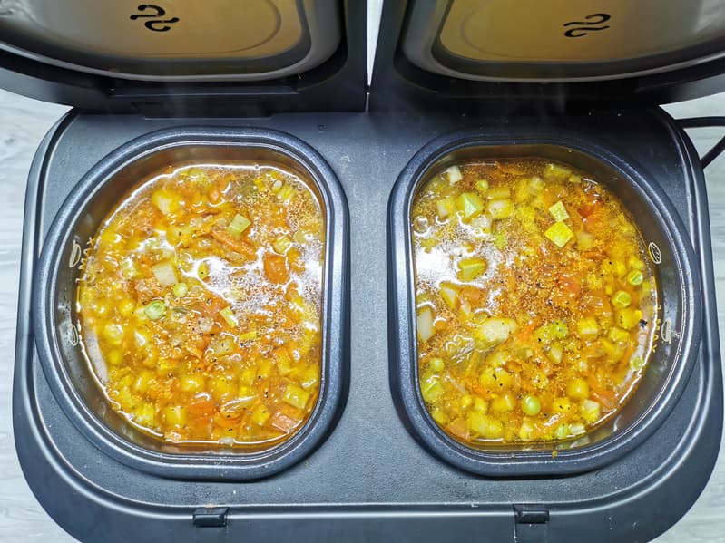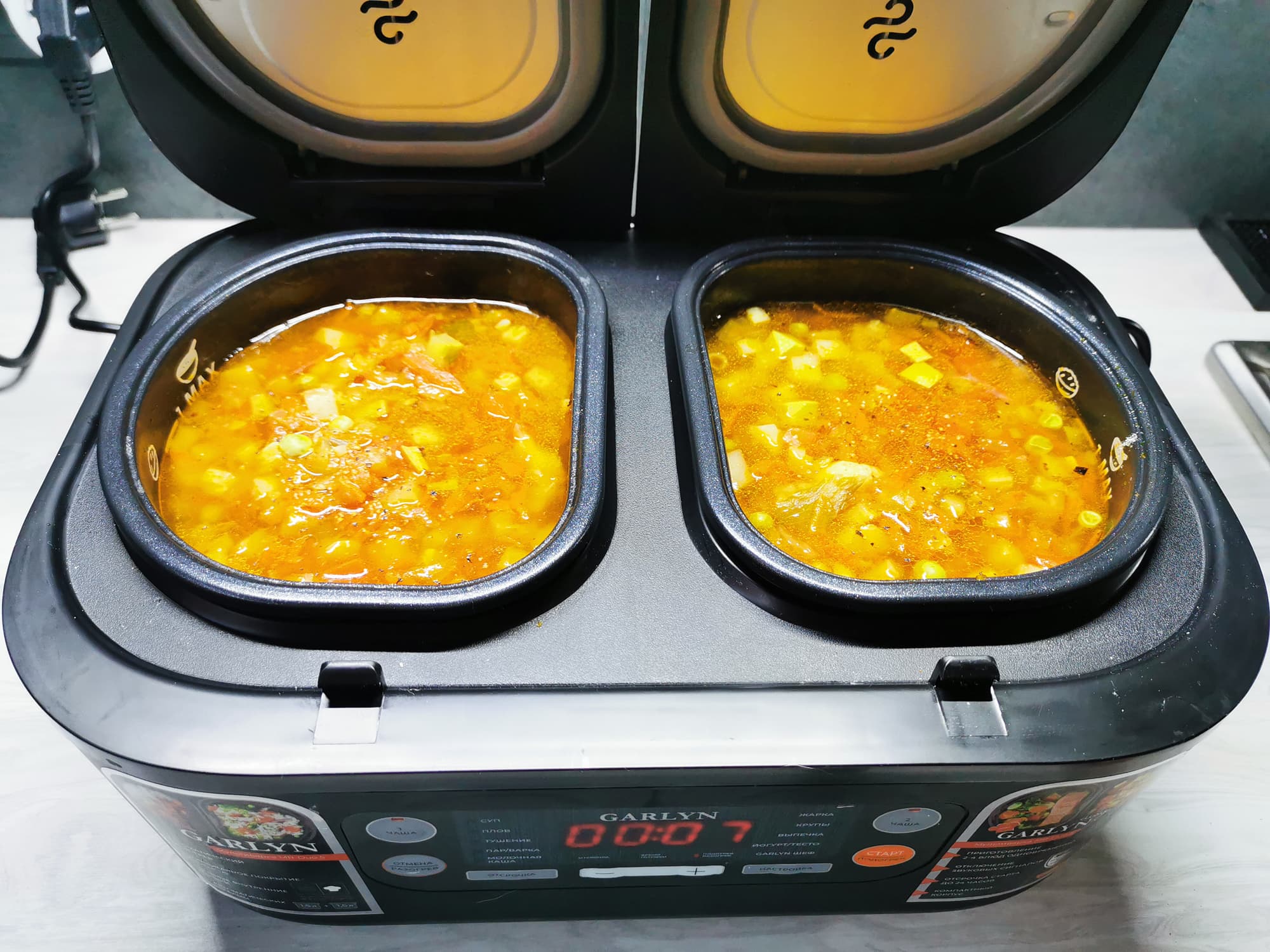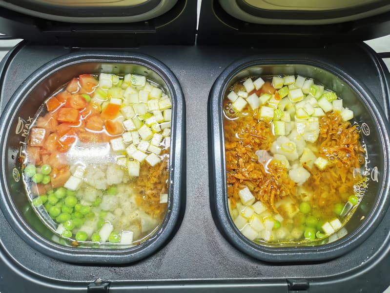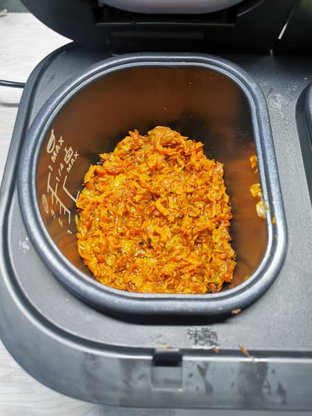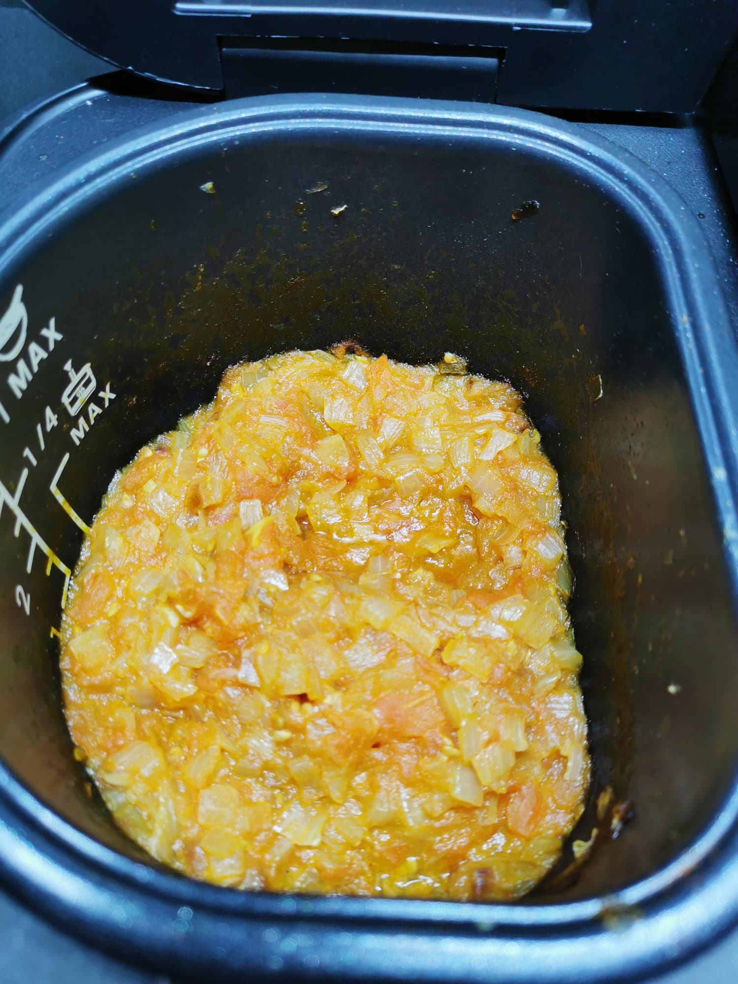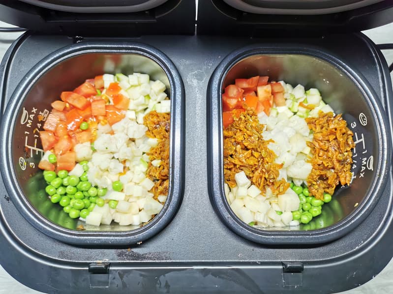 Для обжаривания лука и моркови мы включили в первой чаше программу «Жарка» на 5 минут и добавили в нее оливковое масло. По окончании обжарки мы распределили зажарку поровну по обеим чашам.