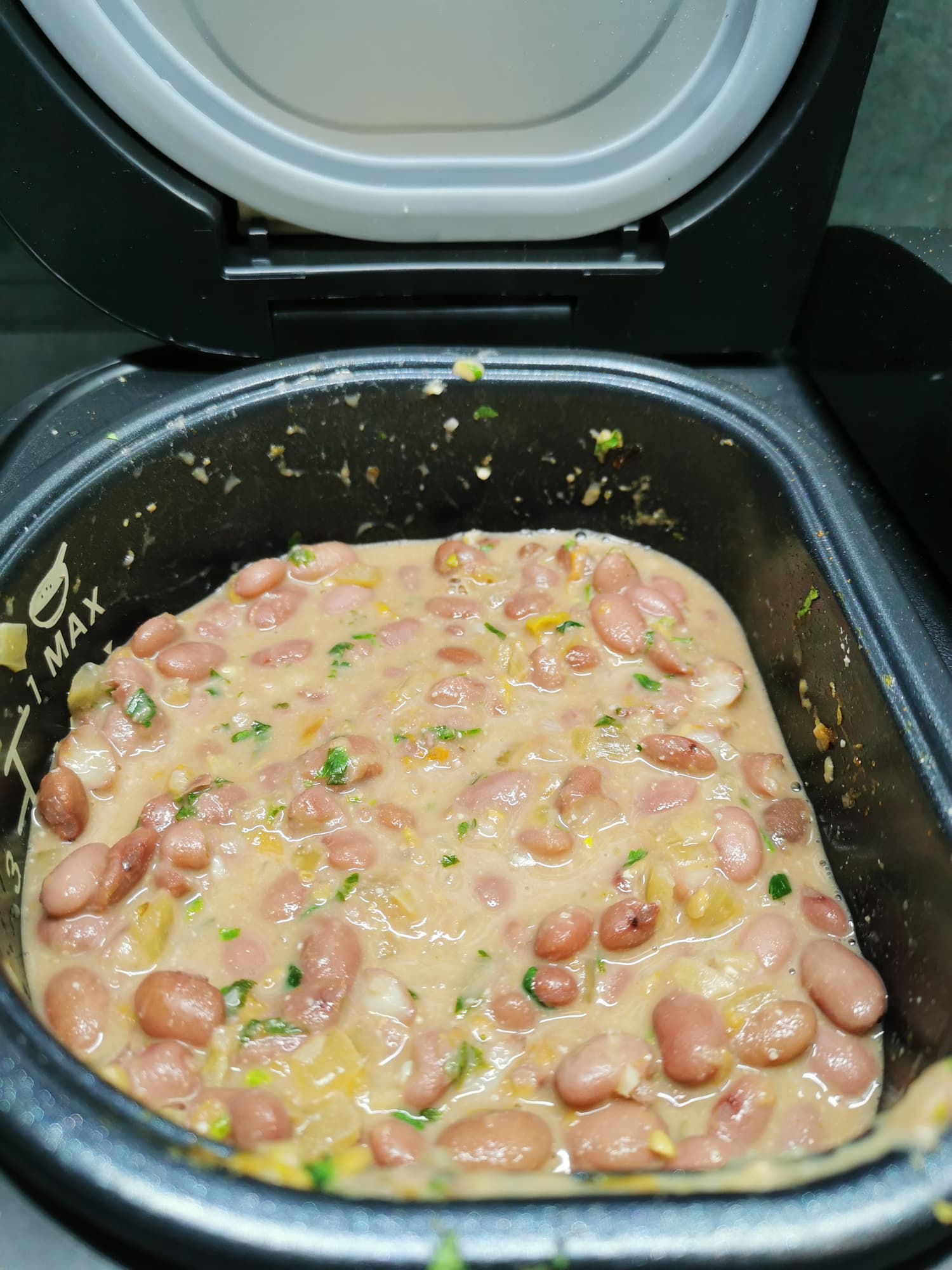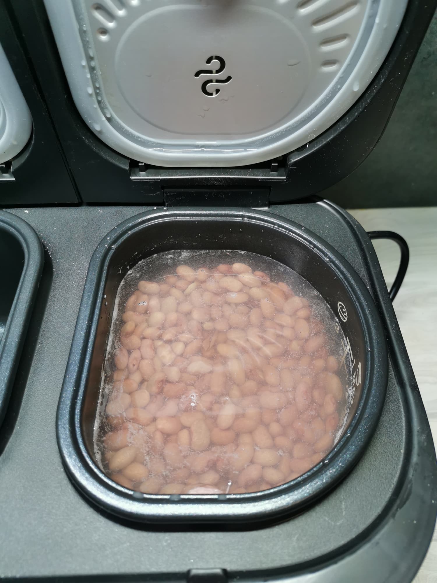 После чего еще раз промыли фасоль и выложили ее в чашу мультиварки, залив сверху водой, после чего запустили режим «Garlyn шеф» на 25 минут и 100 °C.