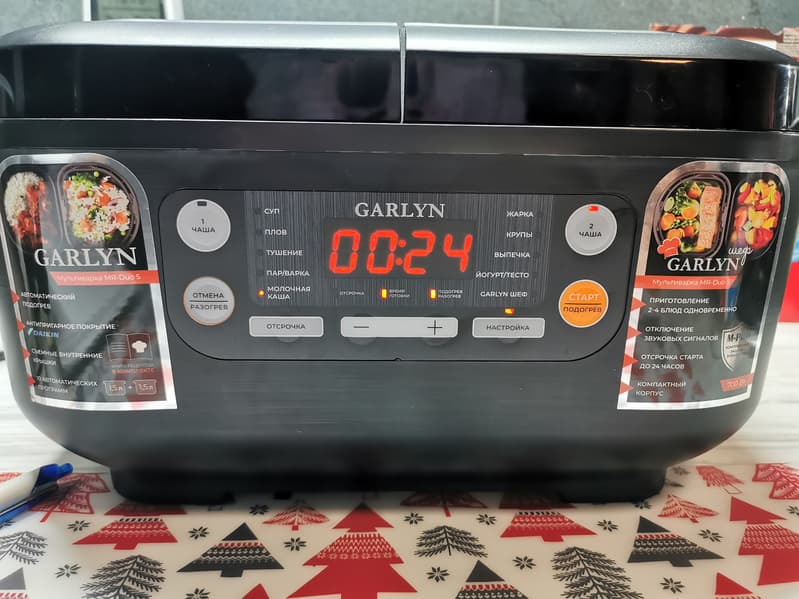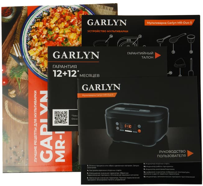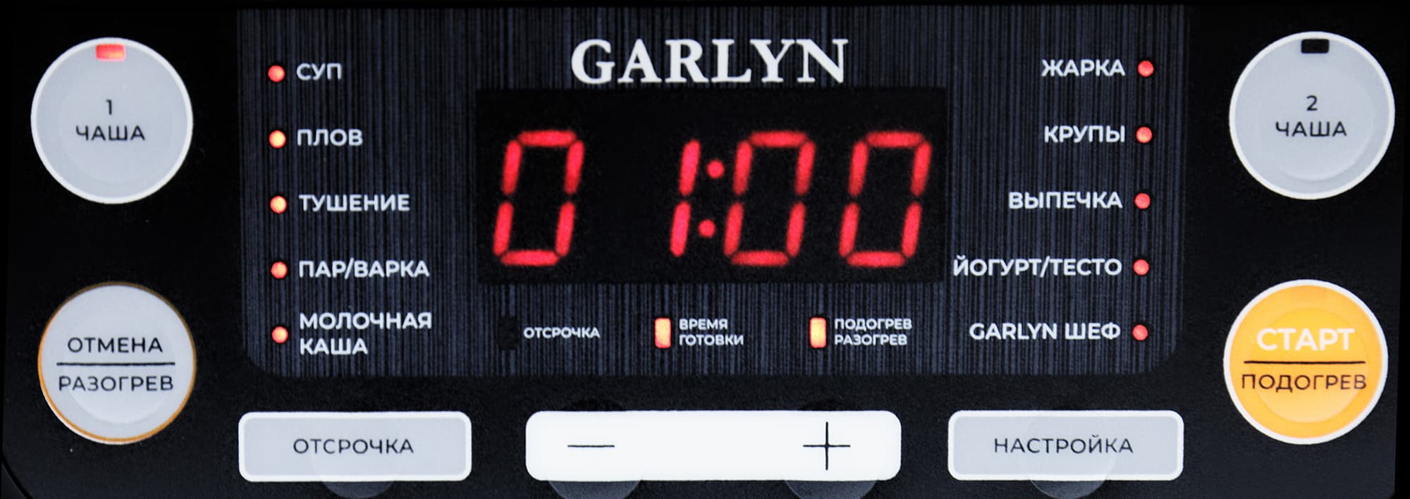 | Программы | молочная каша, жарка, приготовление на пару́, выпечка, тушение, плов, йогурт, тесто, крупа, garlyn шеф |