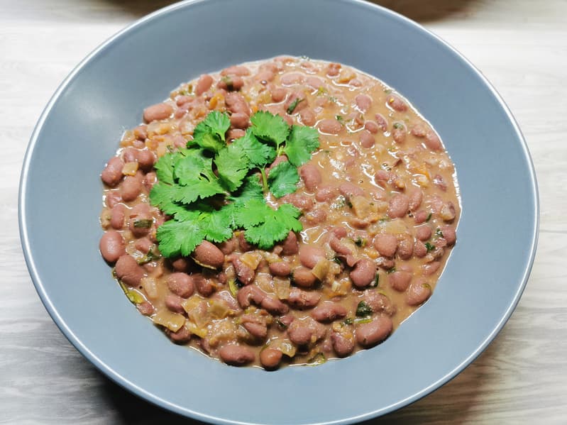 По прошествии полутора часов фасоль приготовилась и мы переложили ее и немного бульона, в котором она варилась, из первой чаши во вторую, добавили хмели-сунели, черный молотый перец и оставили томиться на 4 минуты.