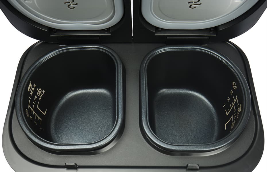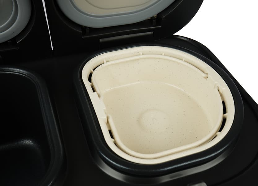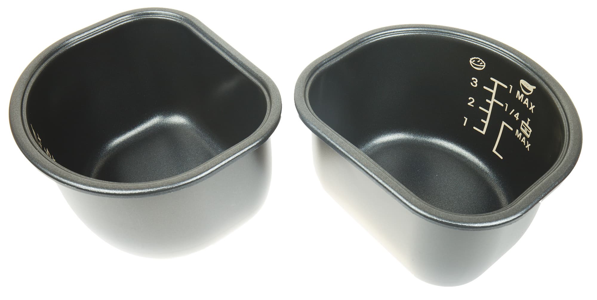 Внутрь корпуса вставляются две чаши, расстояние между ними довольно большое, вынимаются они удобно. В чаши также помещаются пластиковые контейнеры для приготовления на пару́. Емкости чаш и контейнеров могут устанавливаться с любой стороны.