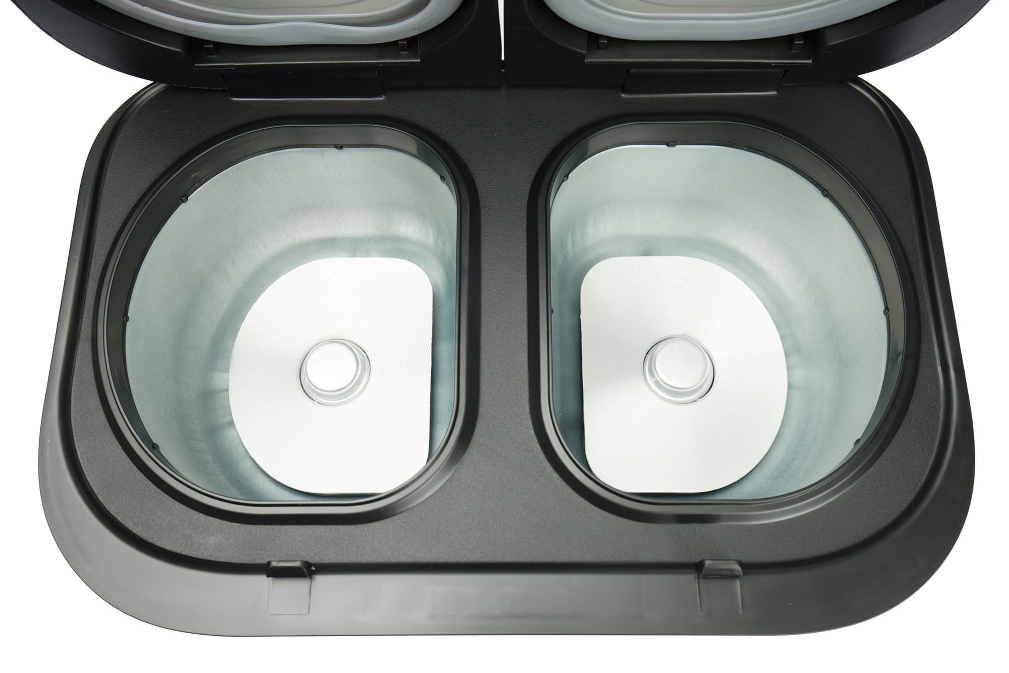 Форма мультиварки Garlyn MR-Duo 5 ближе всего к параллелепипеду со скругленными углами. Корпус устройства выглядит лаконично и современно. Независимые друг от друга крышки открываются наверх при нажатии на кнопки, расположенные прямо на них.