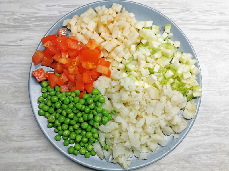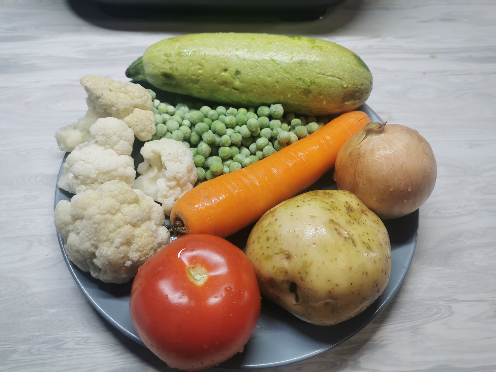 Для приготовления супа нам понадобились соцветия цветной капусты, зеленый горошек, морковь, репчатый лук, маленький кабачок, томаты, картофель и черный молотый перец. Мы взяли всех ингредиентов в два раза больше, чем предлагалось, так как решили готовить суп сразу в двух чашах.