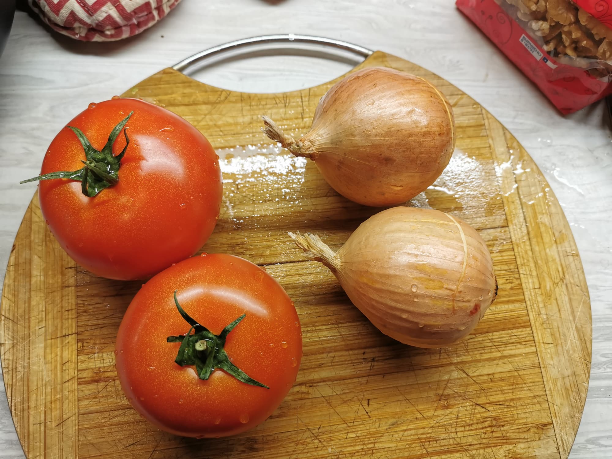 Для приготовления этого блюда нам понадобилась красная фасоль, помидоры, репчатый лук, грецкий орех, кинза, чеснок, красный острый молотый перец, черный молотый перец и специи хмели-сунели.