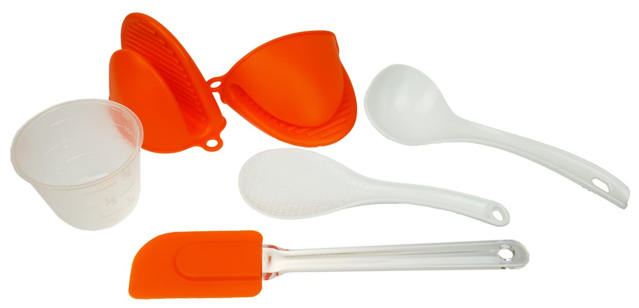 Но на этом производитель не остановился и позаботился об удобстве эксплуатации мультиварки до мелочей. Вместе с устройством поставляются 2 удобные силиконовые прихватки оранжевого цвета с ребристой противоскользящей поверхностью и петельками, чтобы их можно было подвесить, пластиковый мерный стаканчик с градуировкой: риски соответствующие 40, 80, 120, 160 мл и 1/4, 1/2 и 3/4 объема стакана, пластиковые ложка и черпак и силиконовая лопатка.