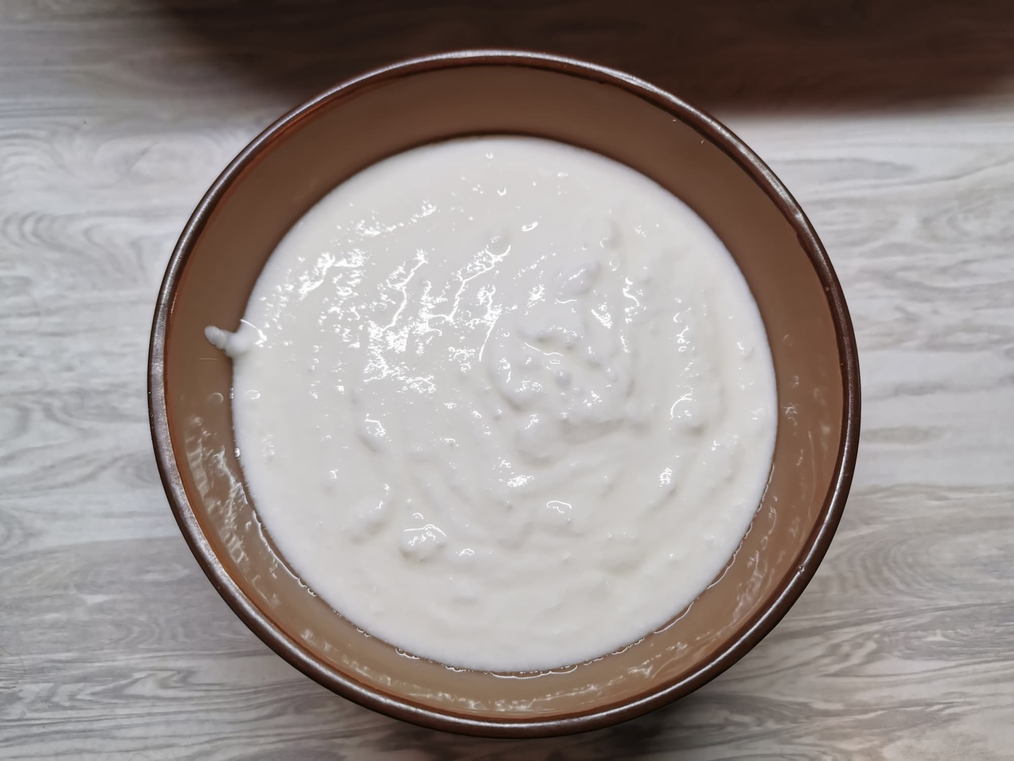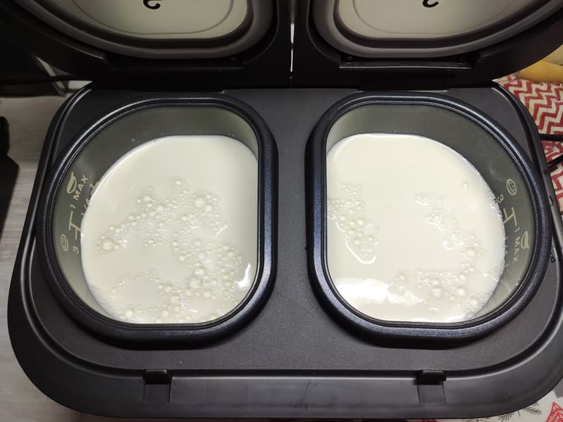 Мы взяли упаковку свежего кисломолочного продукта мацони и 1,5 литра свежего пастеризованного молока, смешали их и поровну разлили по обеим чашам.