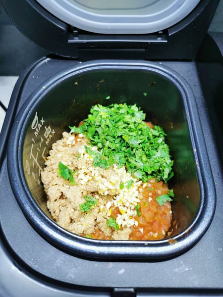 Когда обжарка была завершена, мы также добавили в чашу подготовленные грецкий орех, чеснок и кинзу и запустили режим обжарки еще на 2 минуты.