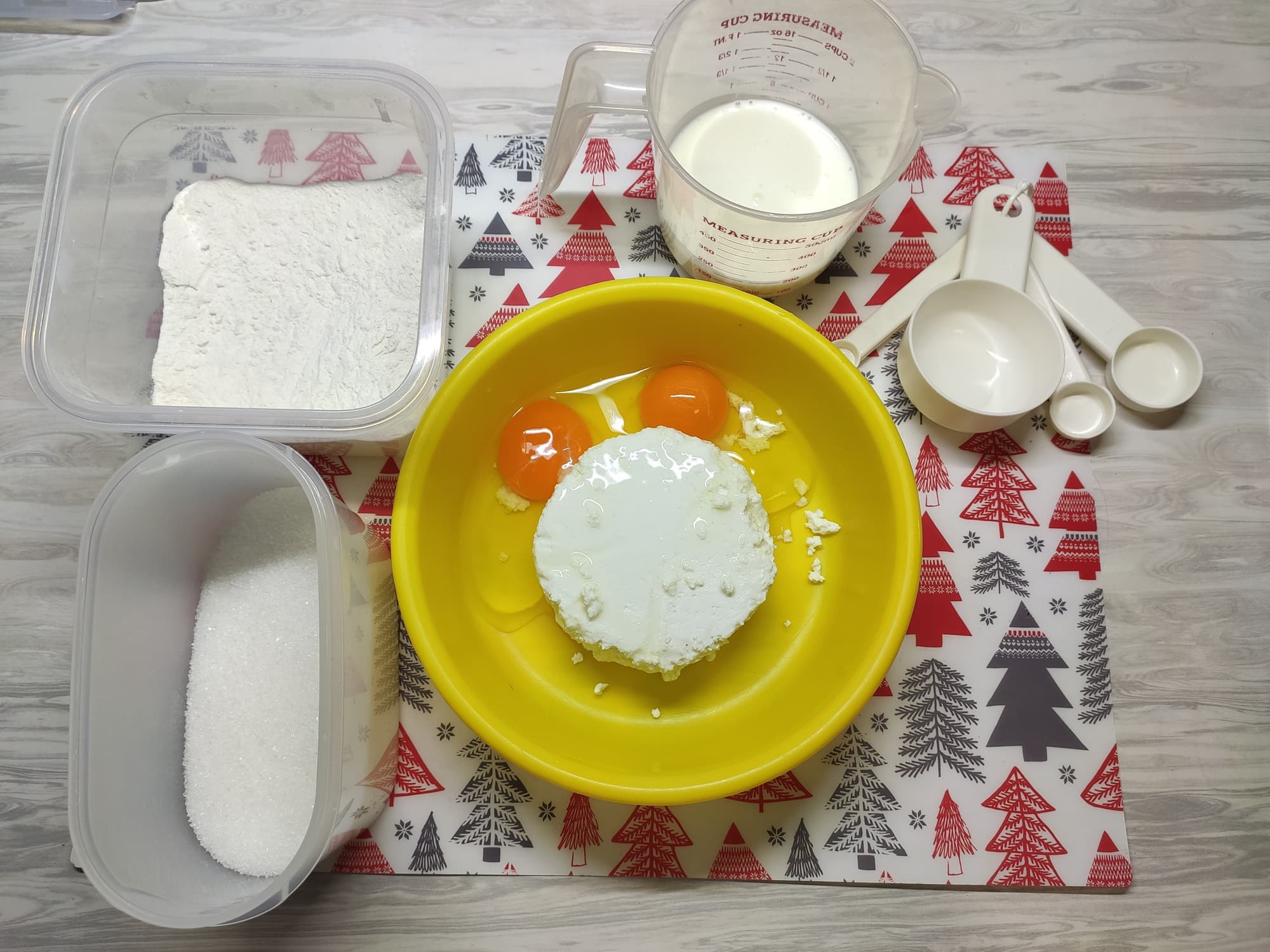 Для приготовления творожной запеканки мы взяли 250 г творога, 2 яйца, 150 мл кефира, 3 столовые ложки сахара, столовую ложку рисовой муки и пару столовых ложек манки для обсыпки чаши.