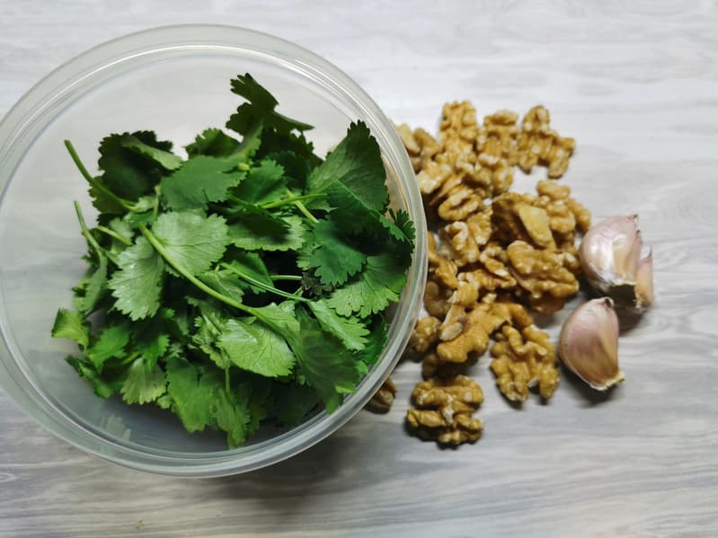 А также вымыли кинзу и порезали ее с чесноком на мелкие кусочки. Грецкий орех мы измельчили в блендере.