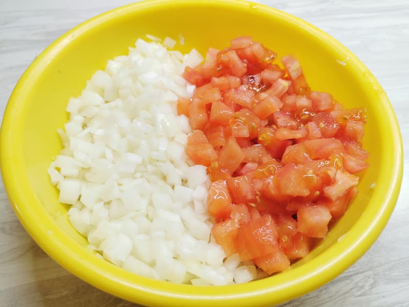 Пока фасоль закипала, мы помыли, очистили от кожуры и порезали на мелкие кубики помидоры и репчатый лук.